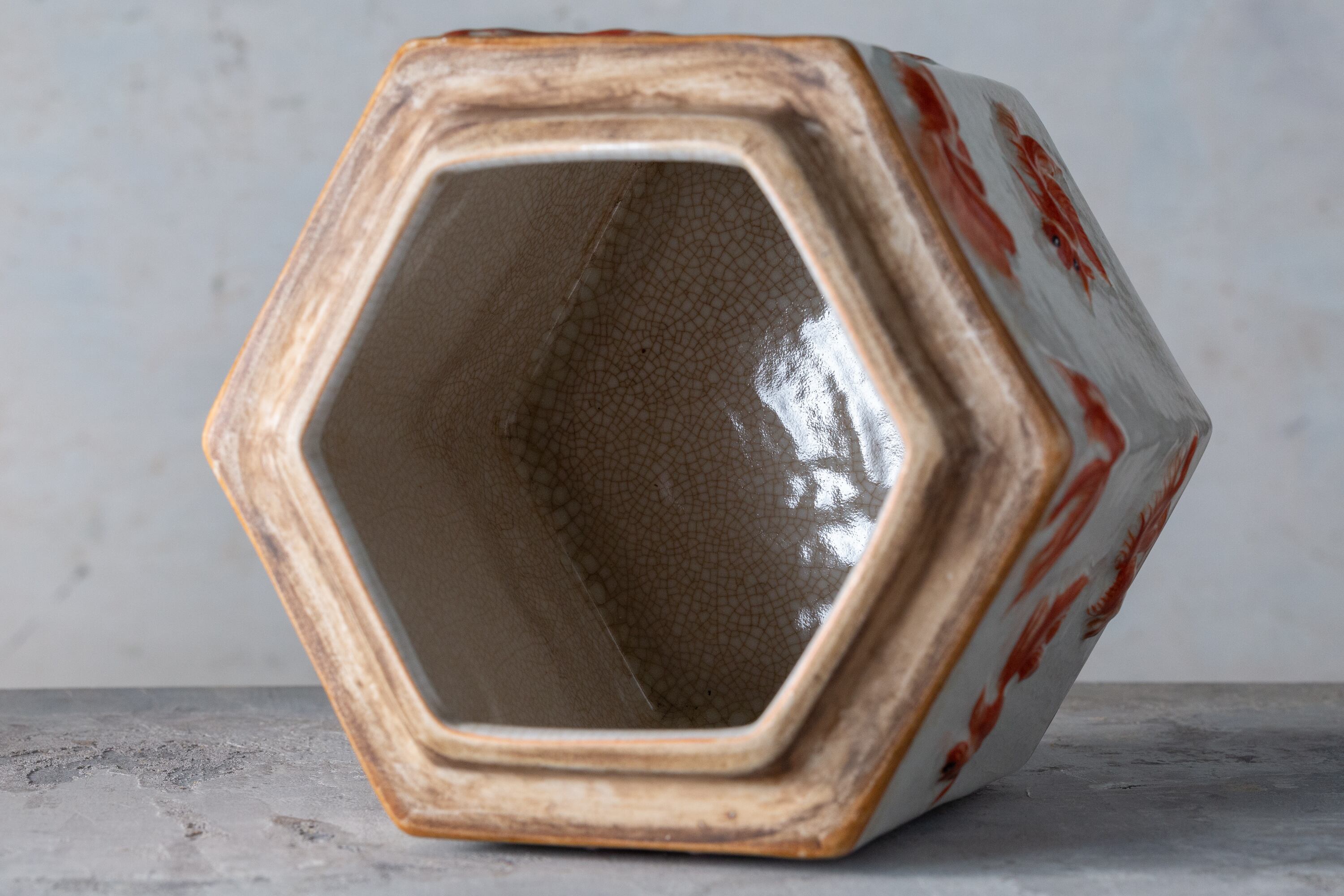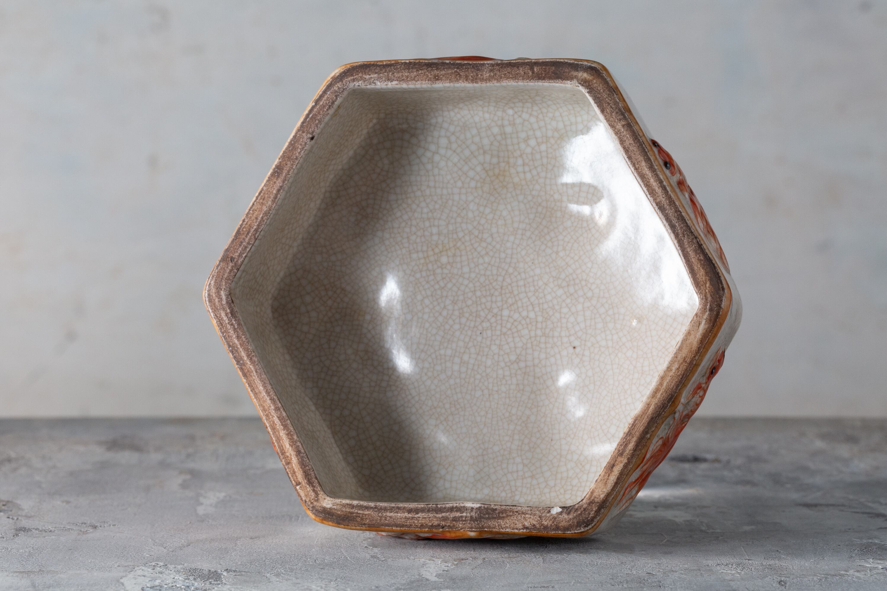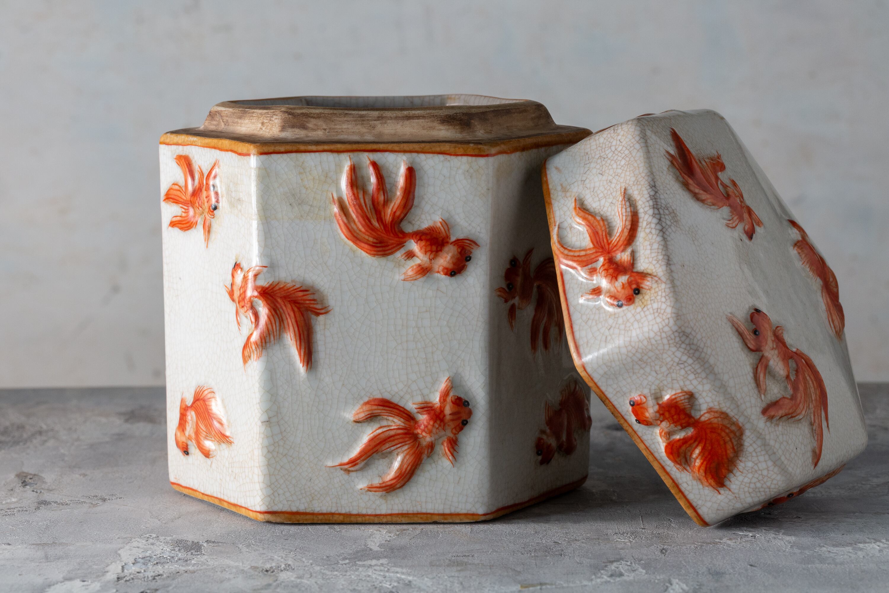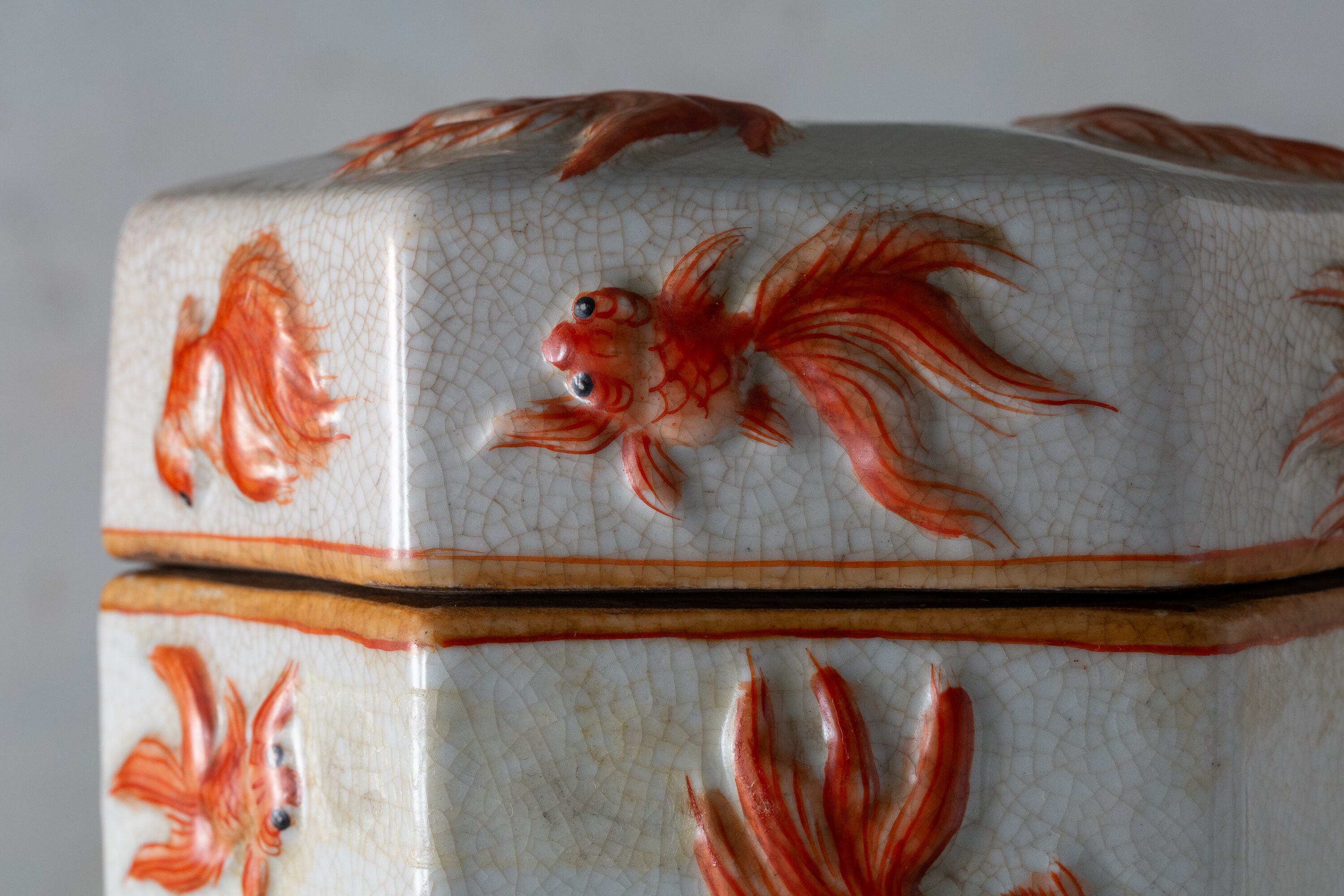 こちらは中国・有間居監製による、金魚の立体浮彫が美しい六角形の水差しです。20世紀の磁器製で、瑞々しい赤絵の金魚が愛らしく全体に泳ぎ回る姿が描かれています。表面の貫入釉は、長い時の流れと味わい深さを感じさせる逸品です。金魚は豊かさや幸運の象徴であり、見る人に安らぎと幸福感をもたらします。