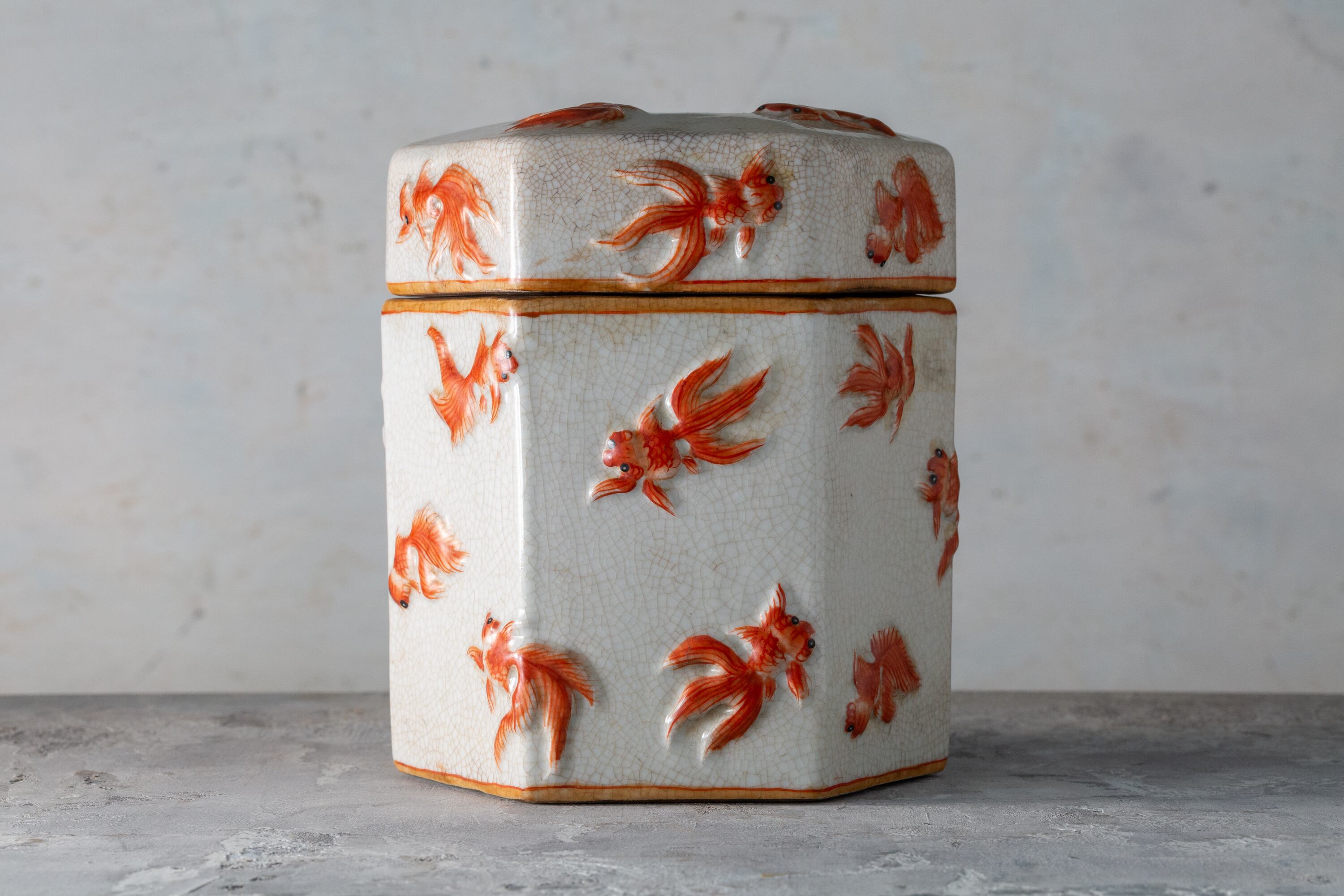 This unique hexagonal water jar was crafted under the supervision of Youjianju (有間居監製) in China during the 20th century. Made of porcelain, the piece is decorated with lively goldfish in raised relief, each fish vividly rendered with charming red overglaze. The surface features a beautiful crackle glaze, evoking an antique sensibility and the gentle passage of time. The goldfish, symbols of abundance and good fortune, seem to swim gracefully around the vessel, infusing any space with a sense of tranquility and happiness.