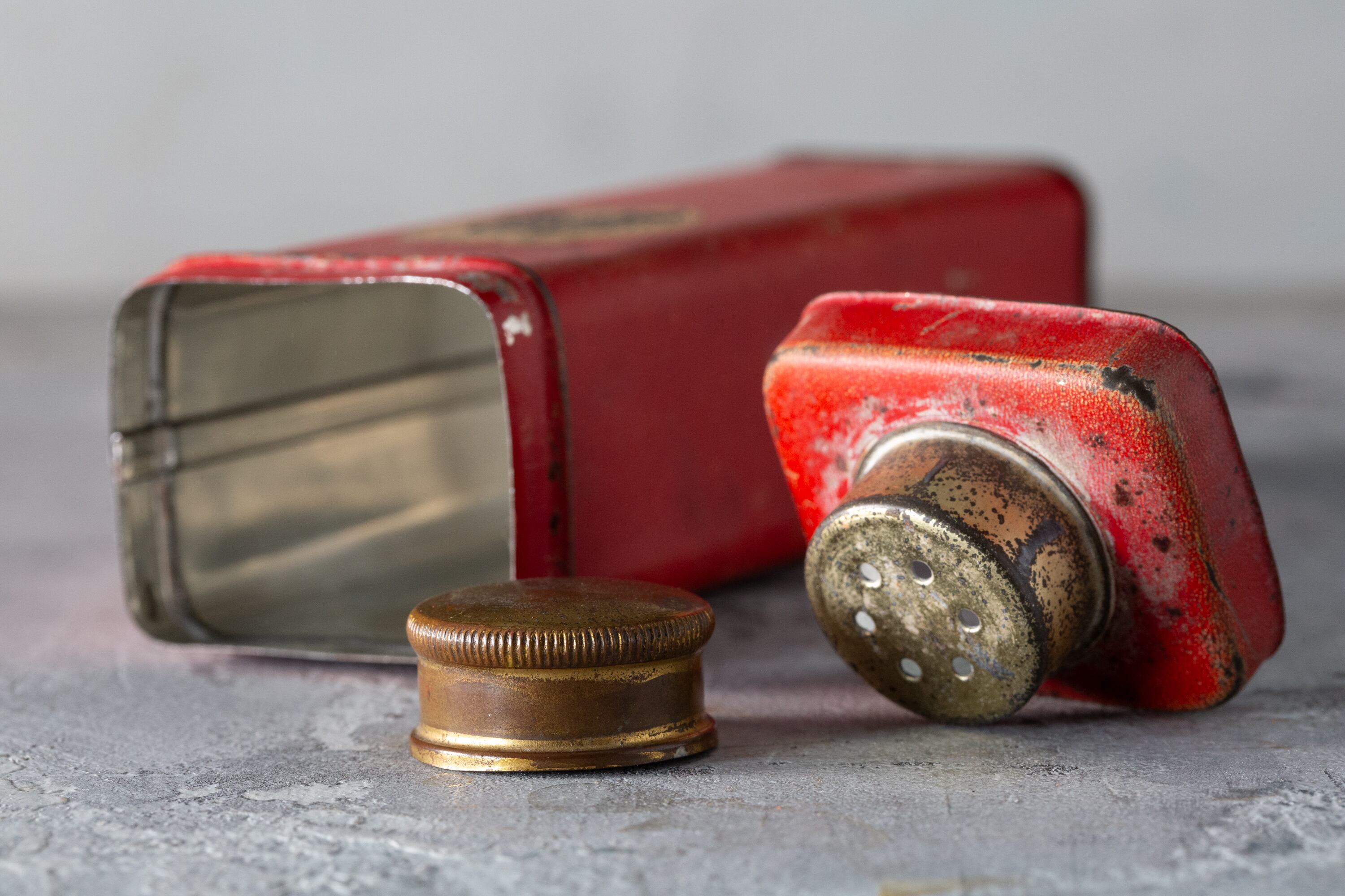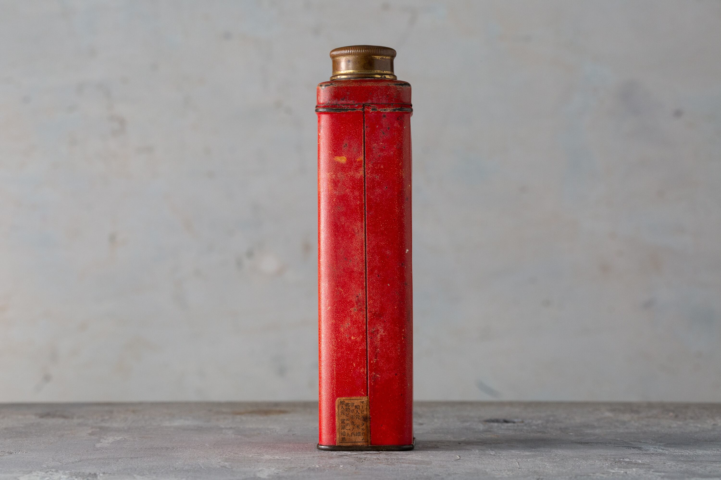 パウダー缶です。鮮やかな赤いボディに、天使のモチーフをあしらった金色の装飾ラベル、穴あきの振り出し口付きスクリューキャップが特徴で、華やかさと実用性を兼ね備えています。ブリキ製で、経年による傷や汚れは見られるものの、構造的には問題なく、色合いも鮮明に残っています。ジャズエイジの魅力を伝える化粧品パッケージとして、ヴィンテージ広告や初期化粧品史、ディスプレイ用コレクションにも最適な一品です。