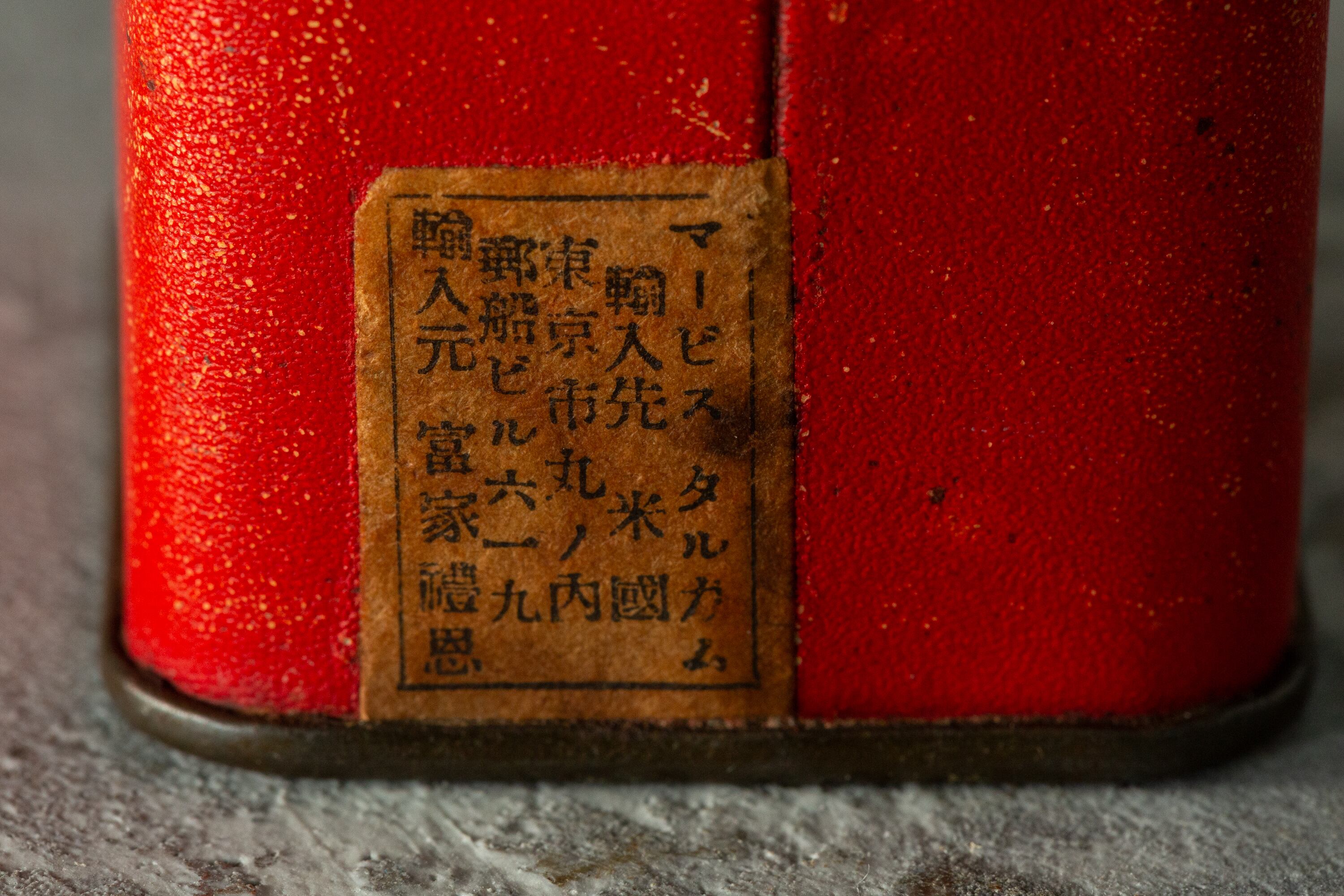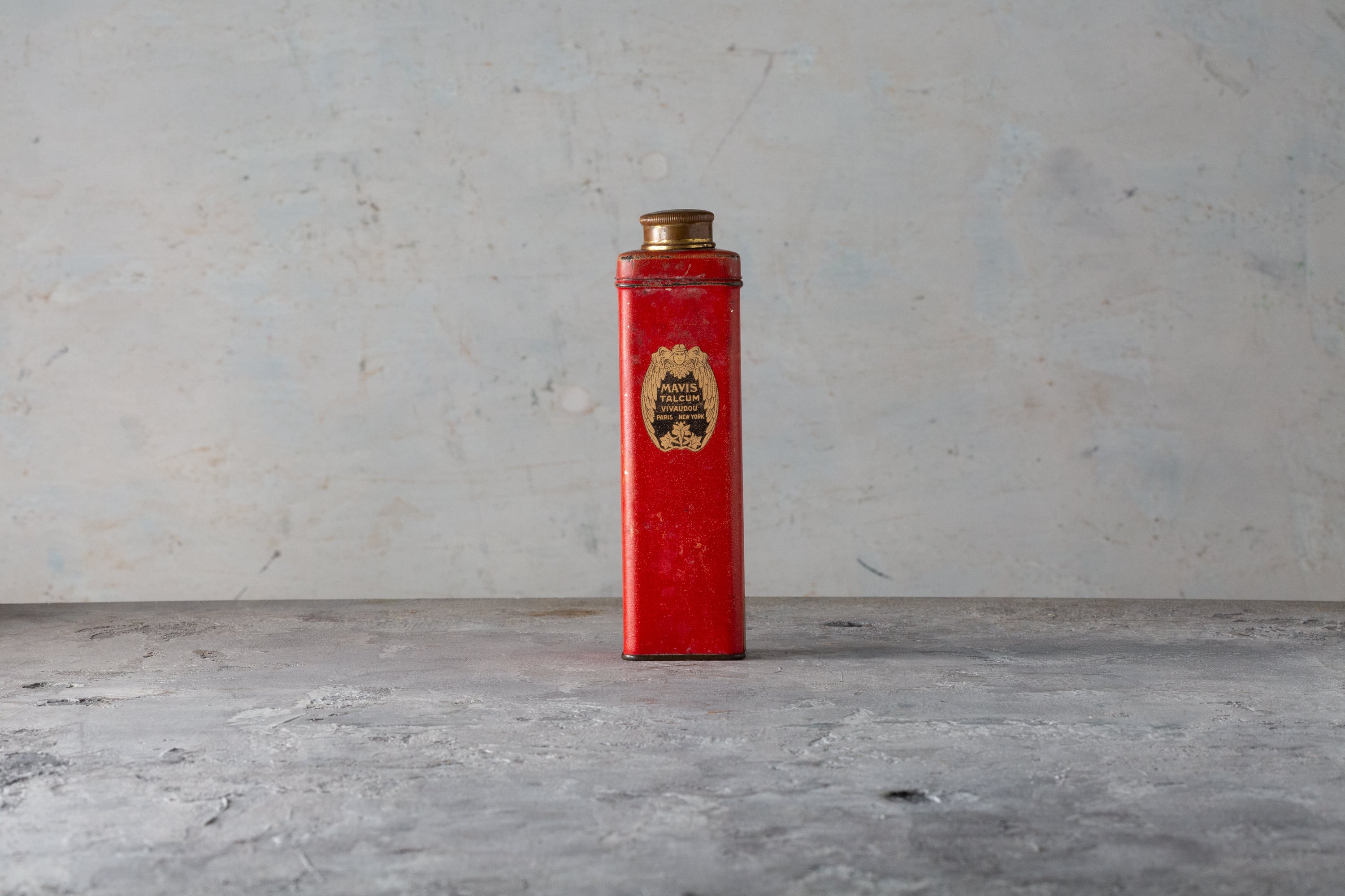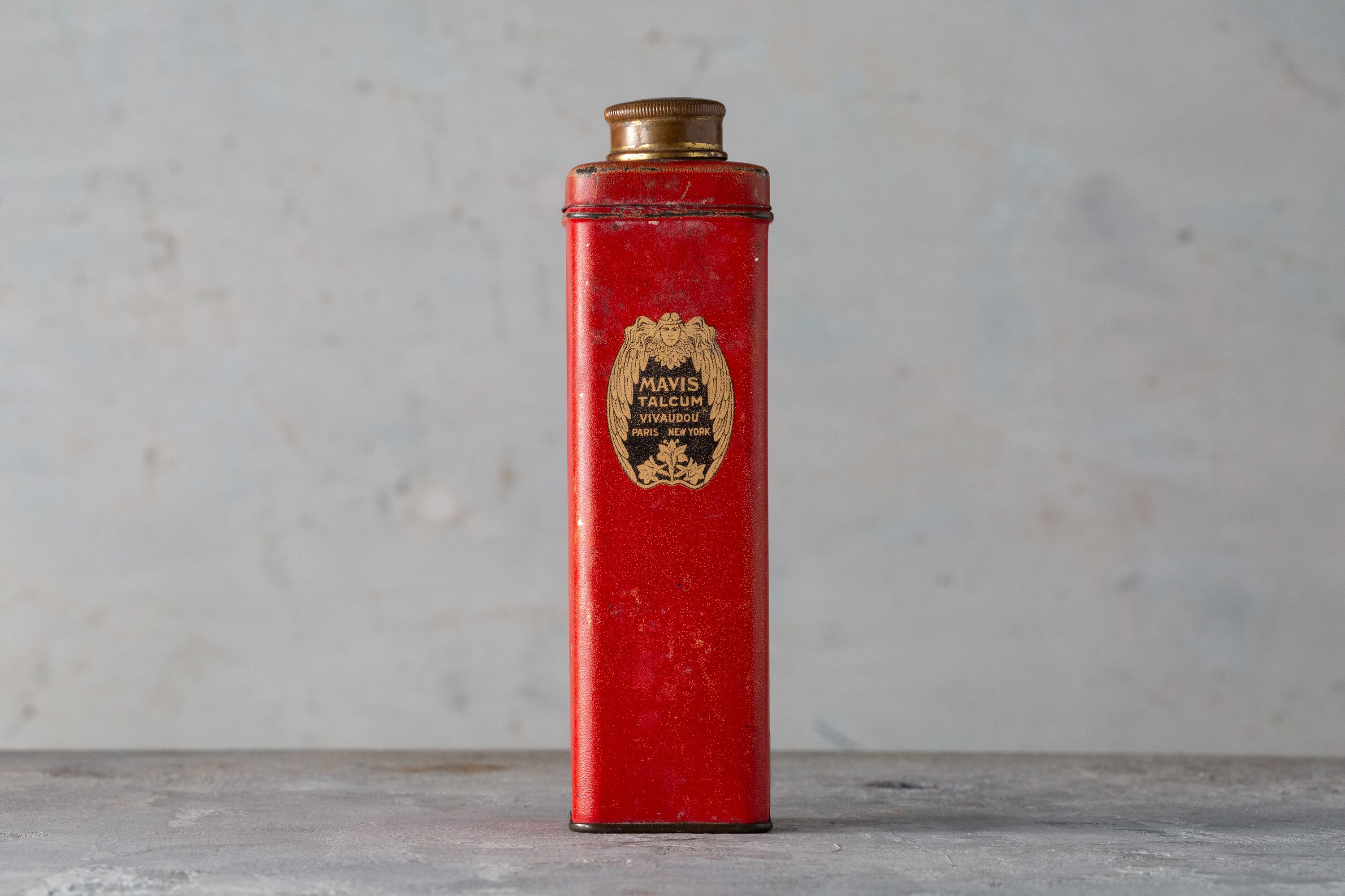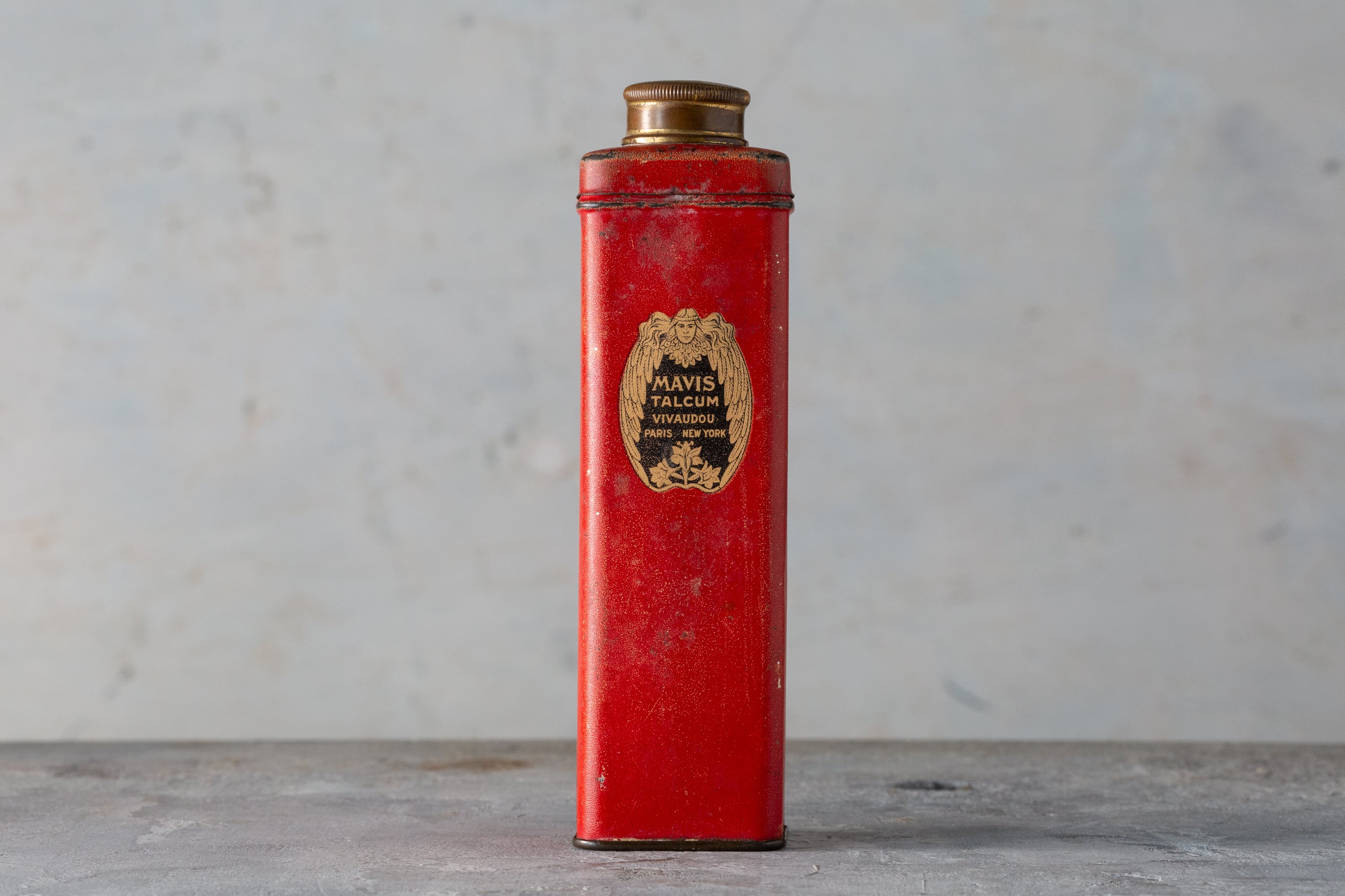 This Mavis Talcum Powder tin by Vivaudou of Paris and New York is a striking example of early 20th-century packaging design. Produced in the 1920s, it features a bold red body, a gold decorative label with an angel motif, and a screw-top lid with shaker holes, reflecting both elegance and practicality. Made of tinplate, it retains its vivid color despite visible scratches, stains, and signs of age, and remains structurally sound. This piece not only embodies the glamour of the Jazz Age but also serves as a charming collectible for vintage advertising, early cosmetic history, or decorative display.