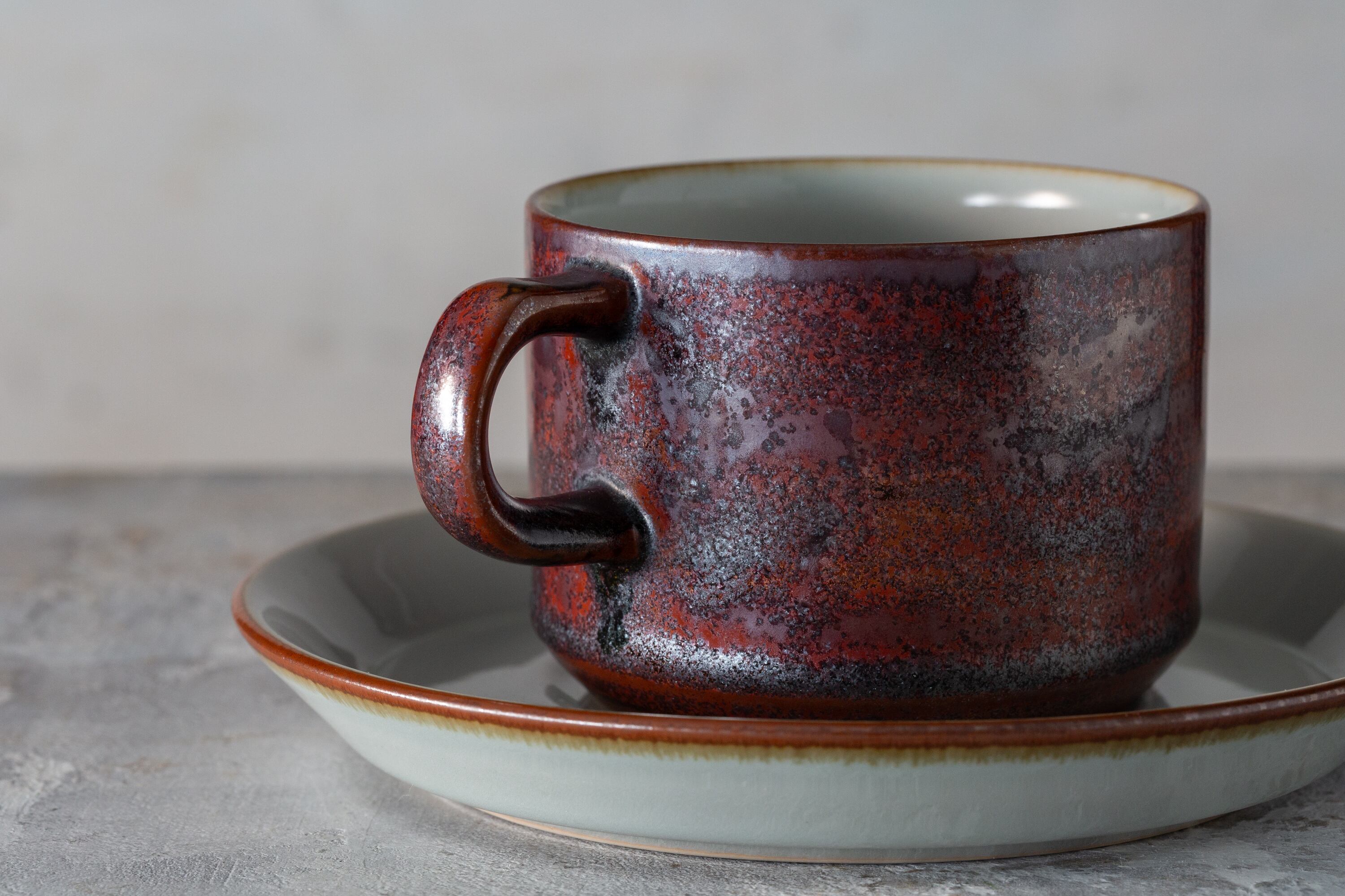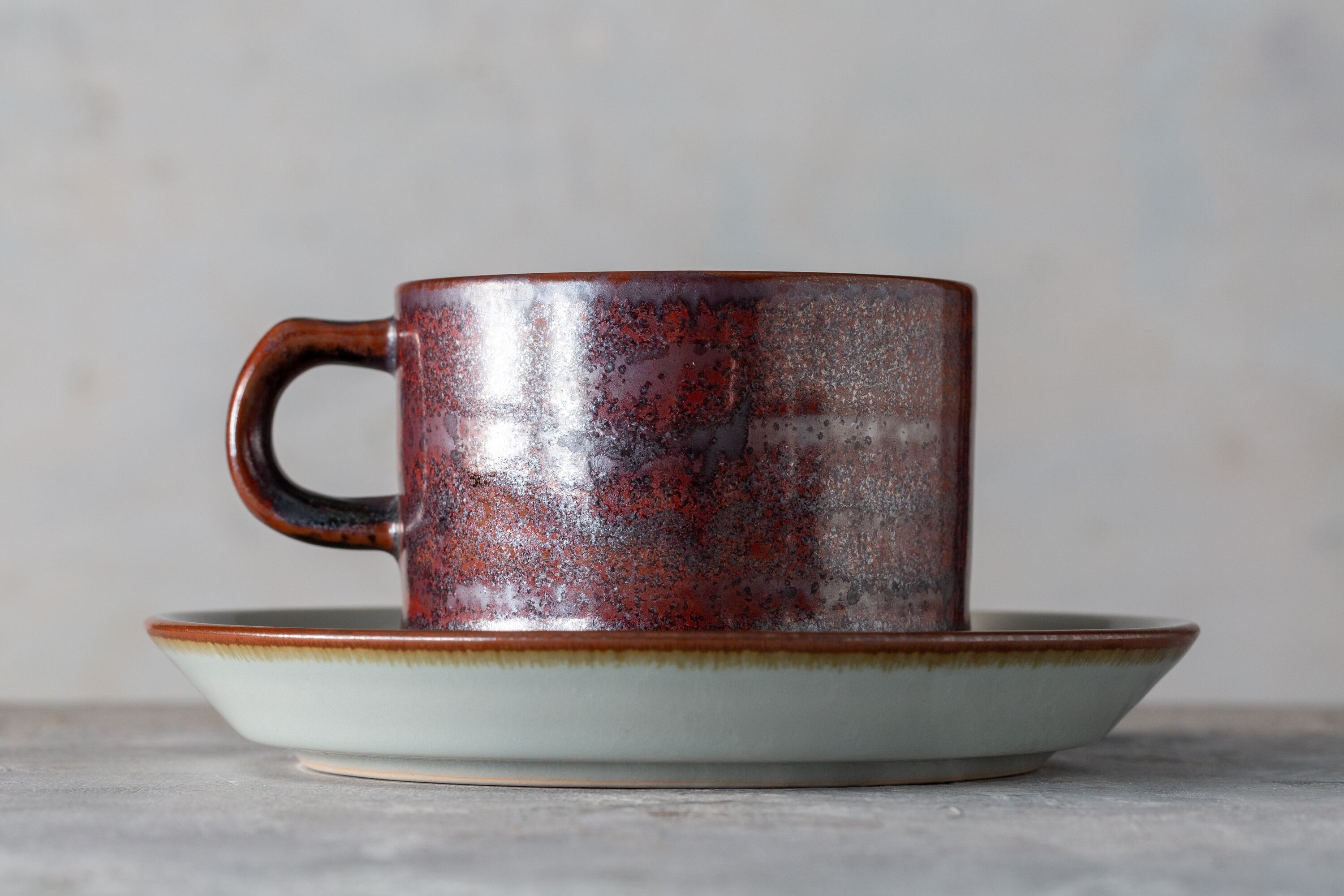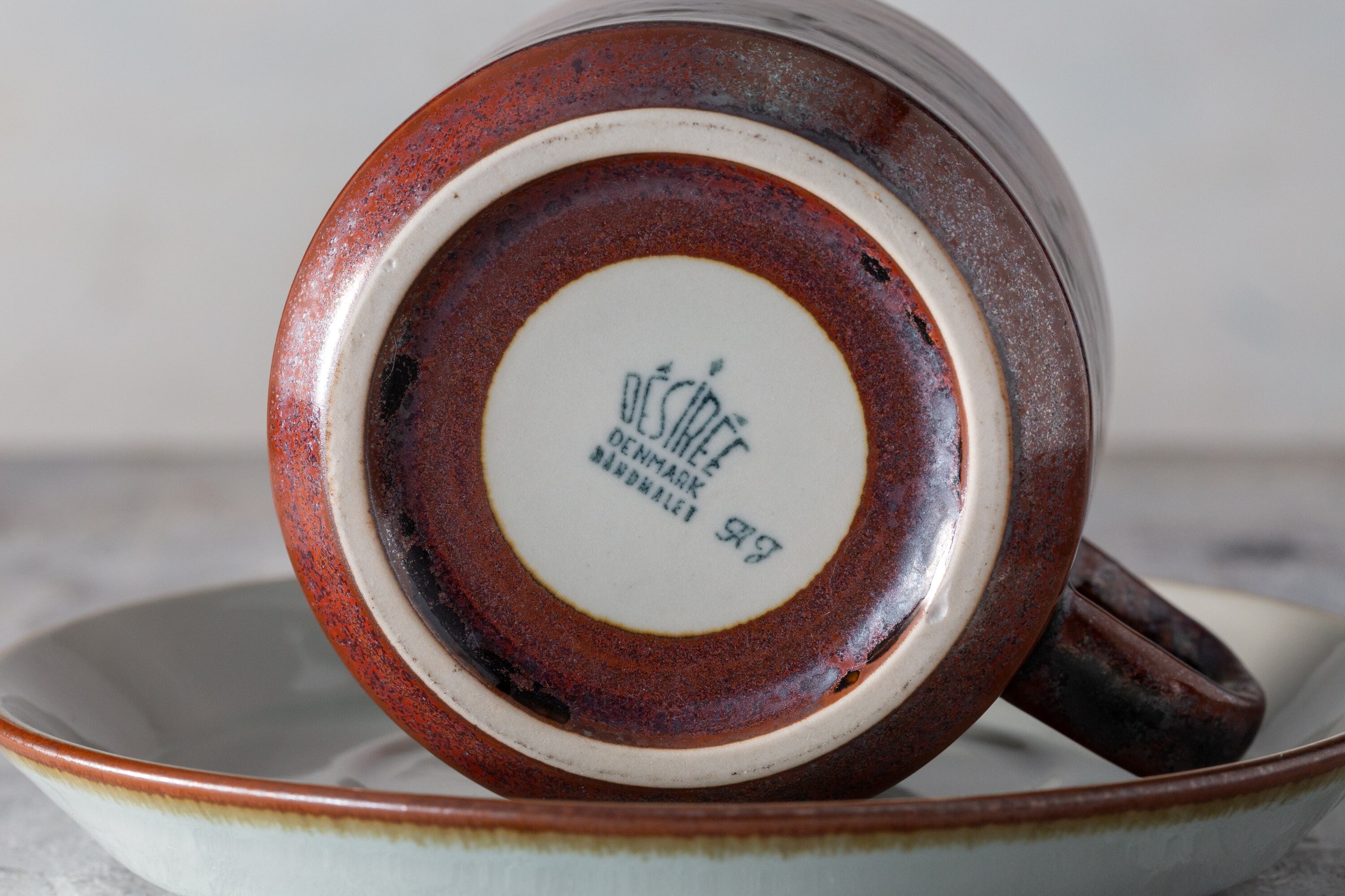 1980年代にデンマークで作られたデジレー Thule カップ&ソーサーは、北欧のミニマリズムと日本の侘び寂びが響き合う調和の美を宿しています。赤褐色の釉薬に浮かぶ斑点は燃え尽きる焔の名残を思わせ、淡い灰色の内側は瞑想的で静謐な時間を映します。