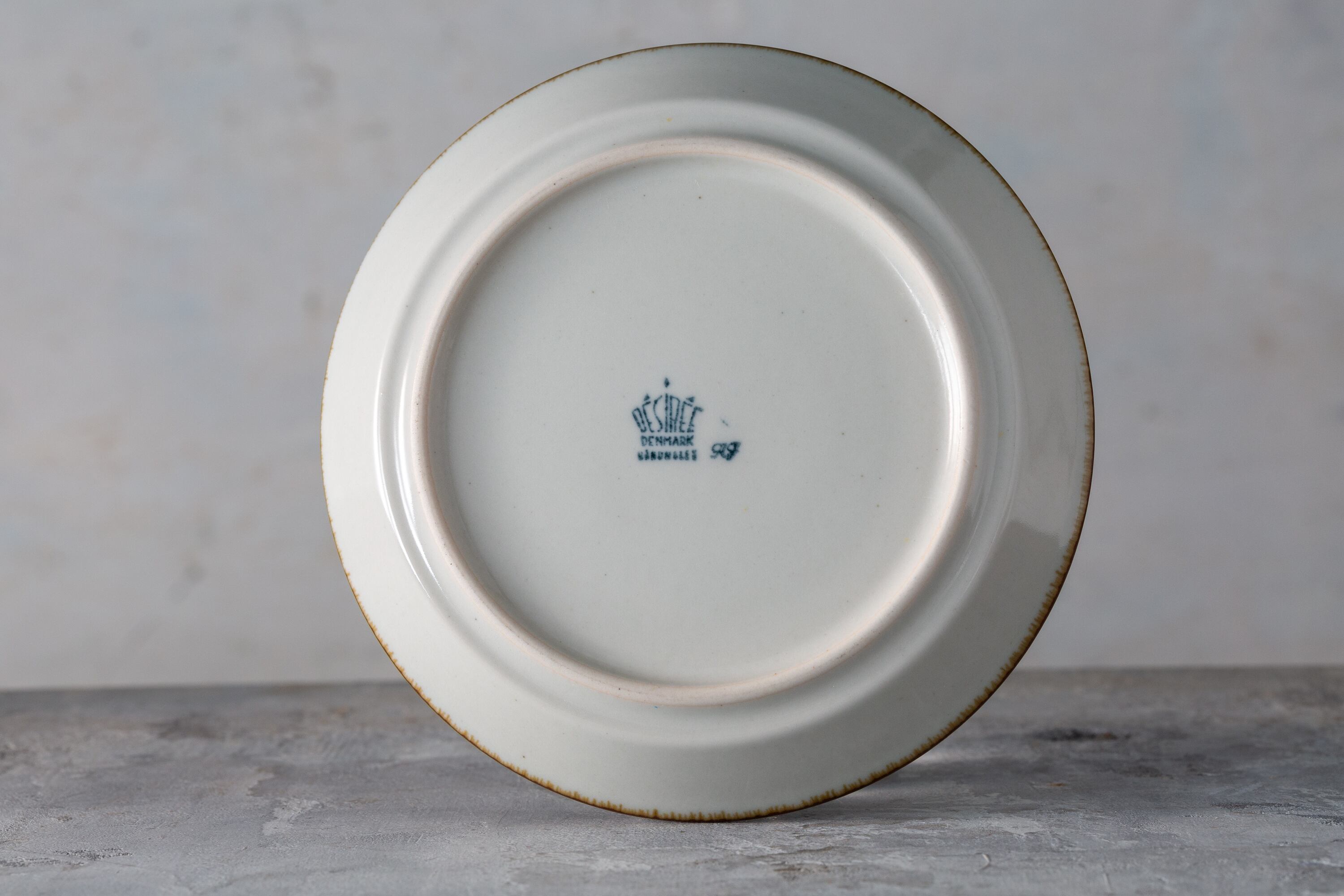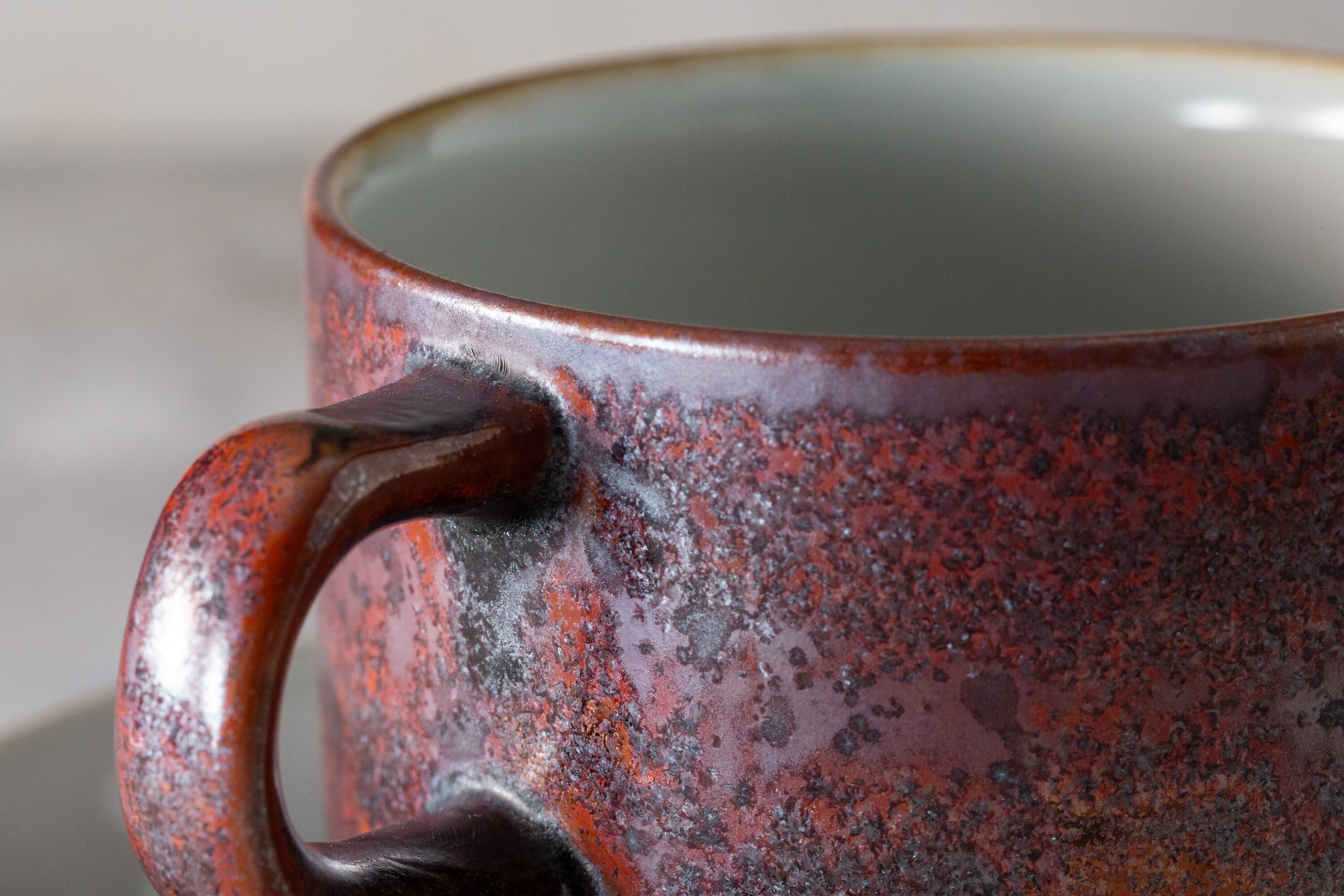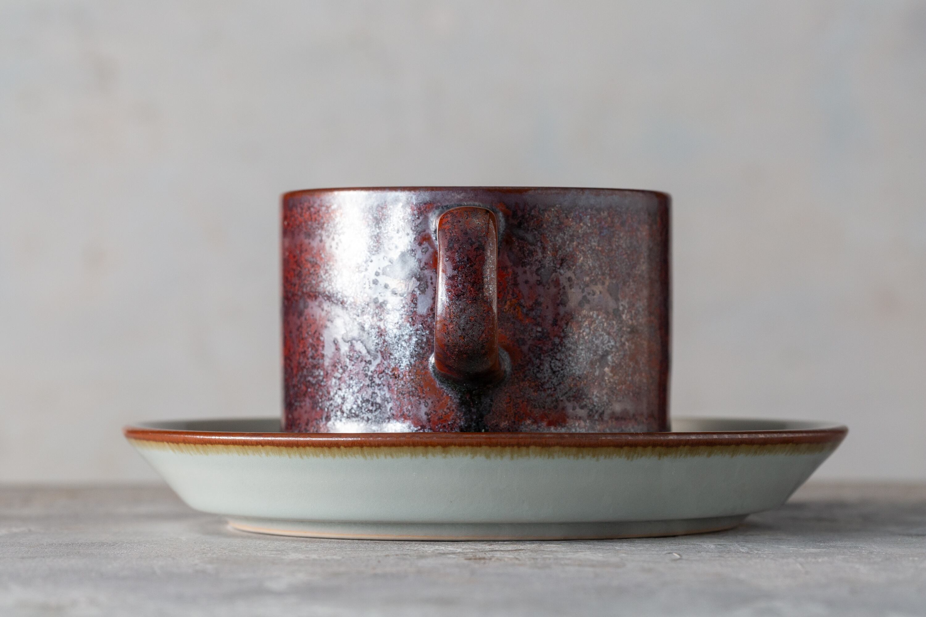 1980年代にデンマークで作られたデジレー Thule カップ&ソーサーは、北欧のミニマリズムと日本の侘び寂びが響き合う調和の美を宿しています。赤褐色の釉薬に浮かぶ斑点は燃え尽きる焔の名残を思わせ、淡い灰色の内側は瞑想的で静謐な時間を映します。