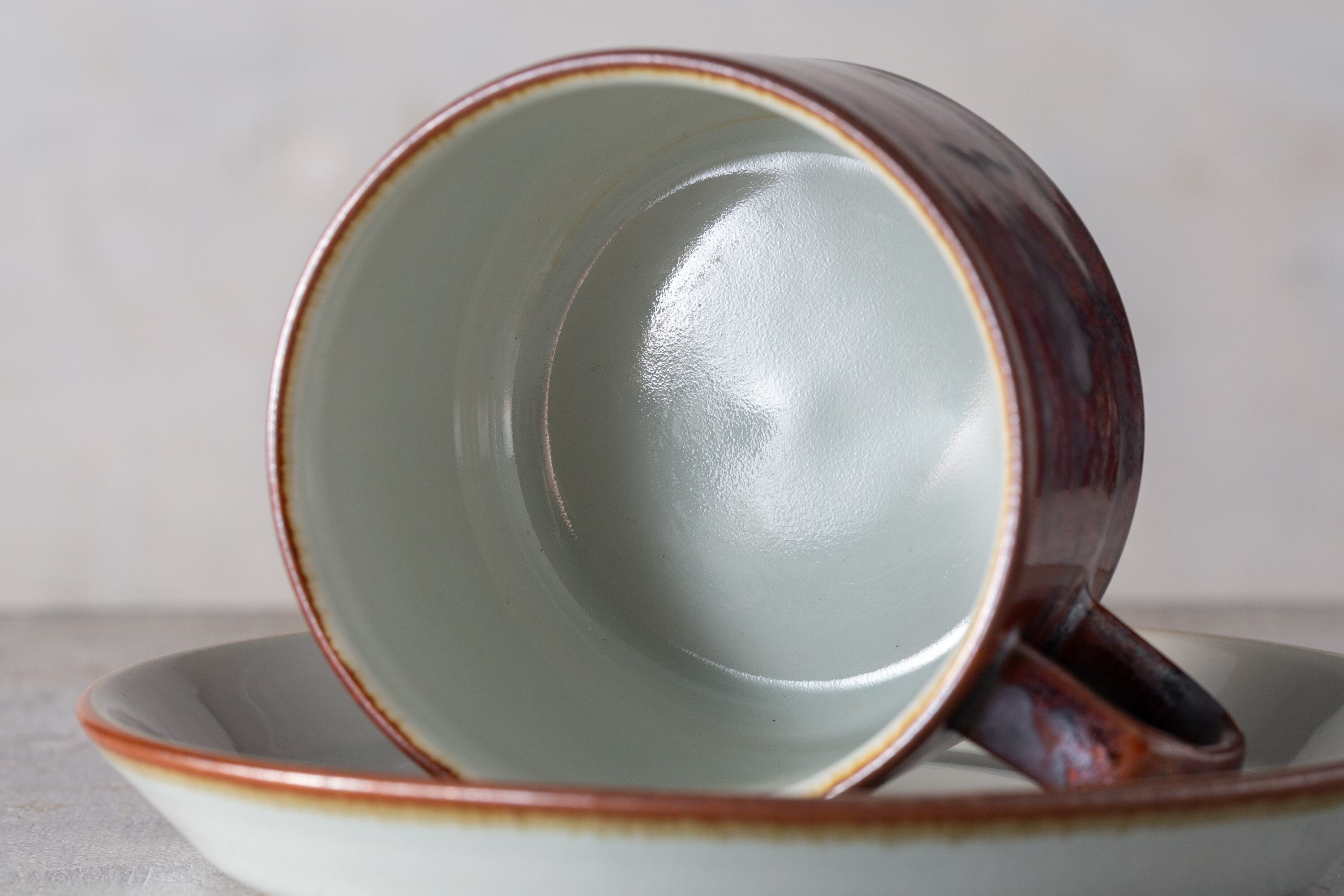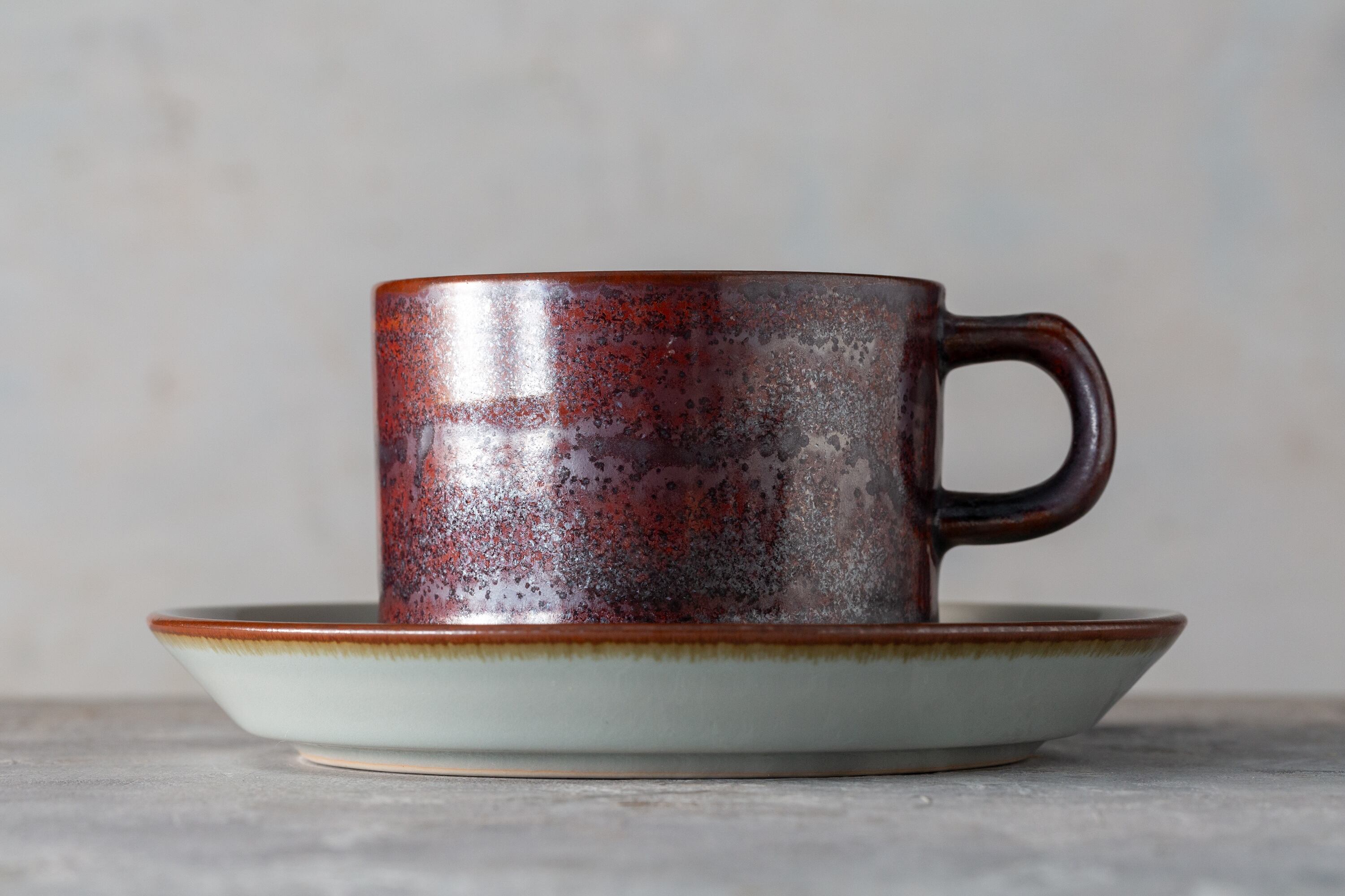 This Désirée Thule cup and saucer, crafted in Denmark in the 1980s, reflects a dialogue between Nordic minimalism and the Japanese sense of wabi-sabi. Its warm reddish-brown glaze, sprinkled with subtle speckles, recalls the glow of fading embers, while the pale gray interior conveys a serene, meditative calm.