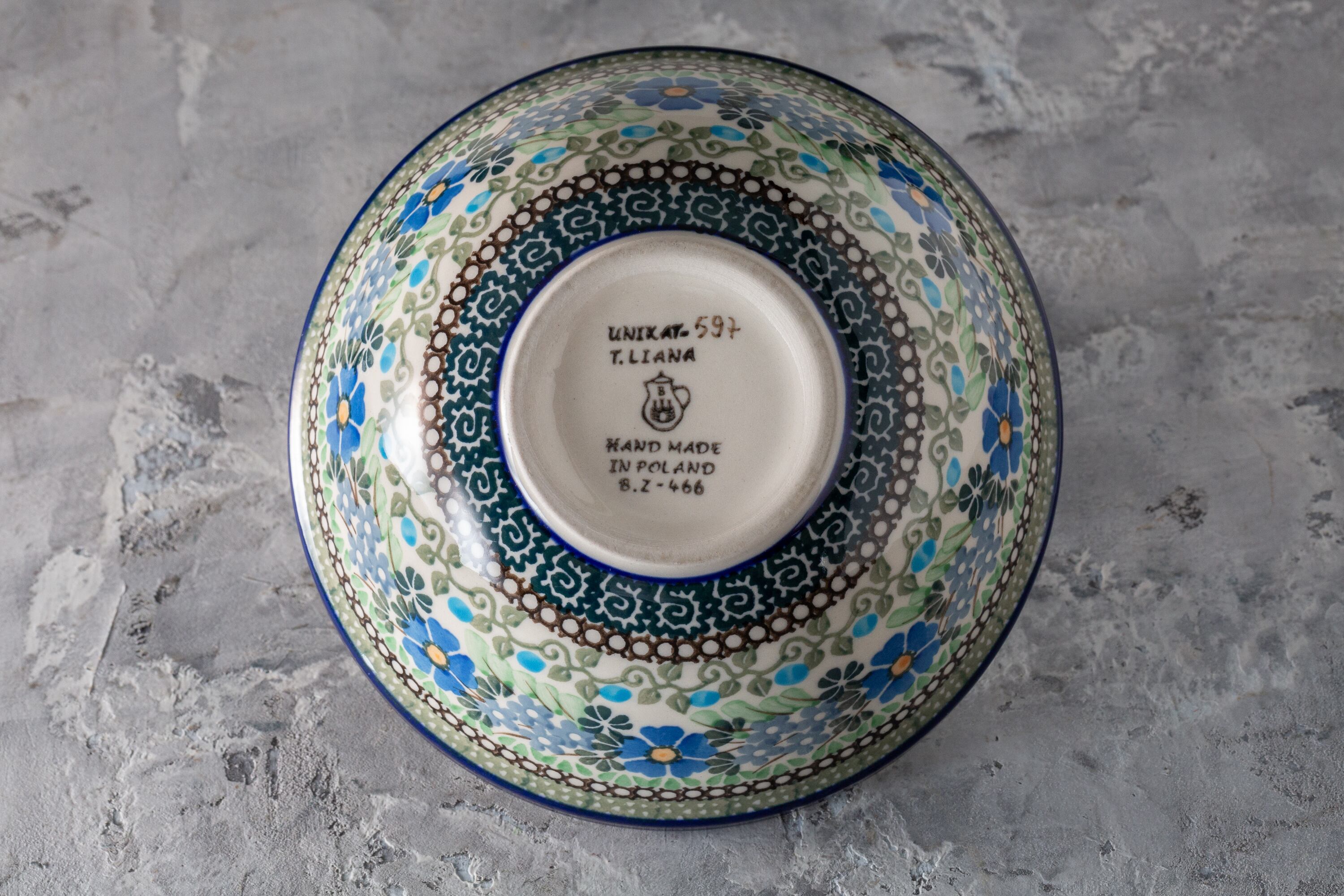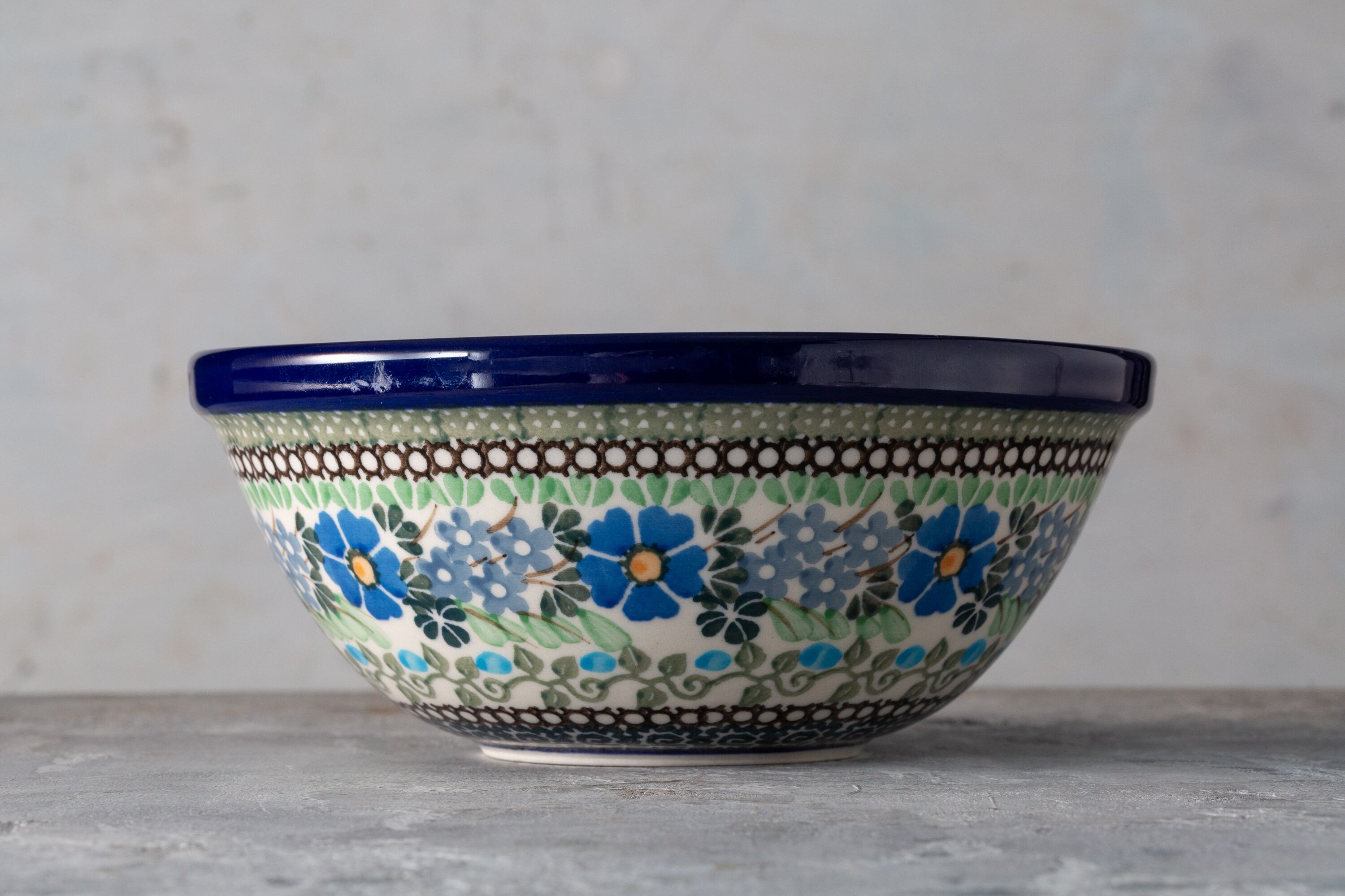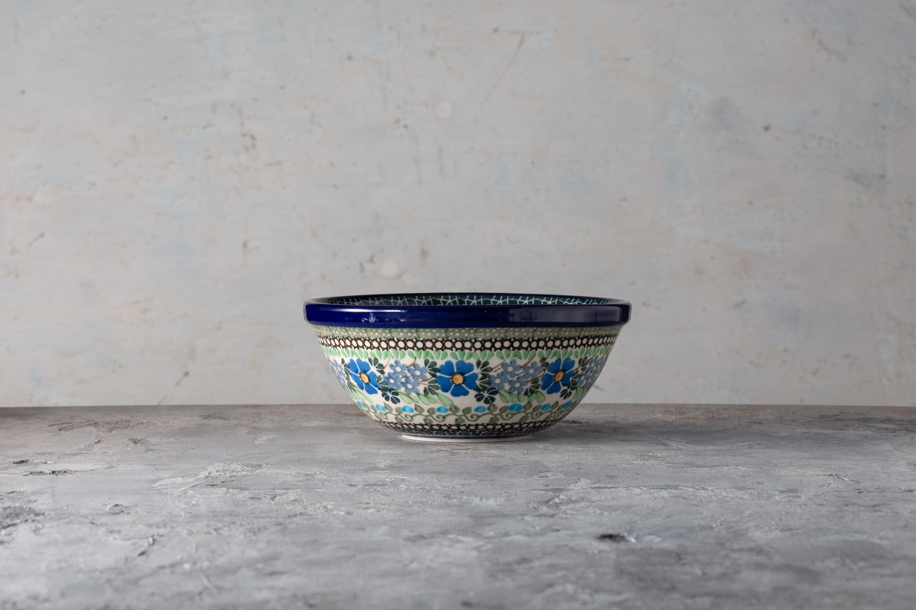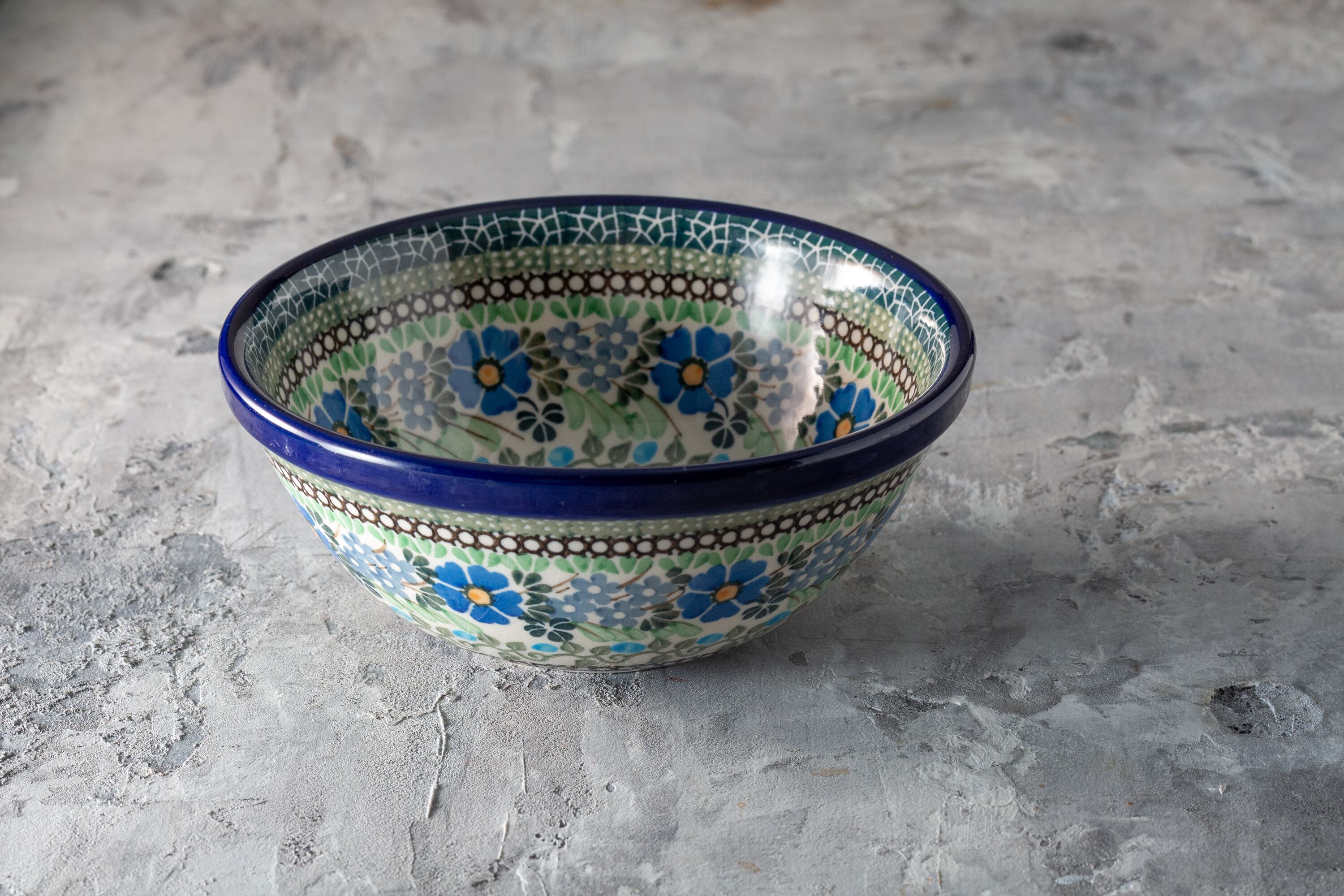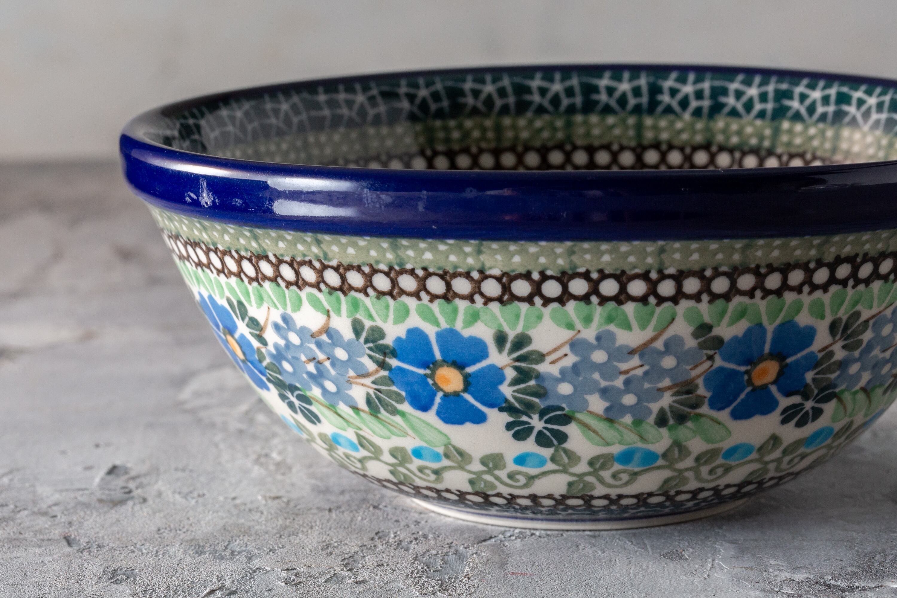 1980年代にポーランドの陶都ボレスワヴィエツで作られたセラミカ・アルティスティッチナのシリアルボウルは、ポーランド陶器の美の伝統を体現する逸品です。鮮やかな青い花模様と緻密なフォークアート風の縁取りが手描きで施され、一筆ごとに職人の温もりが感じられます。