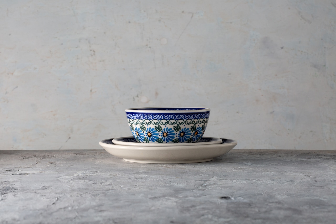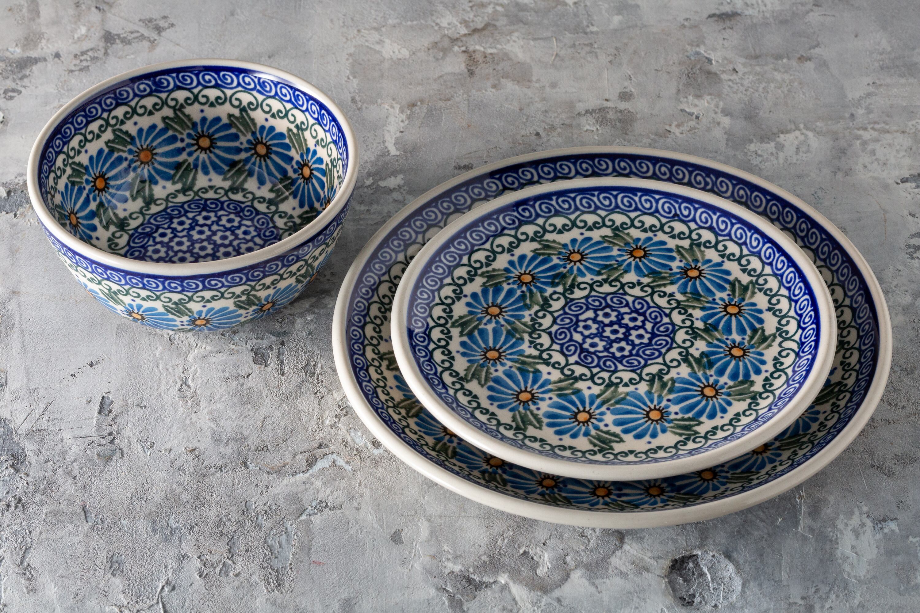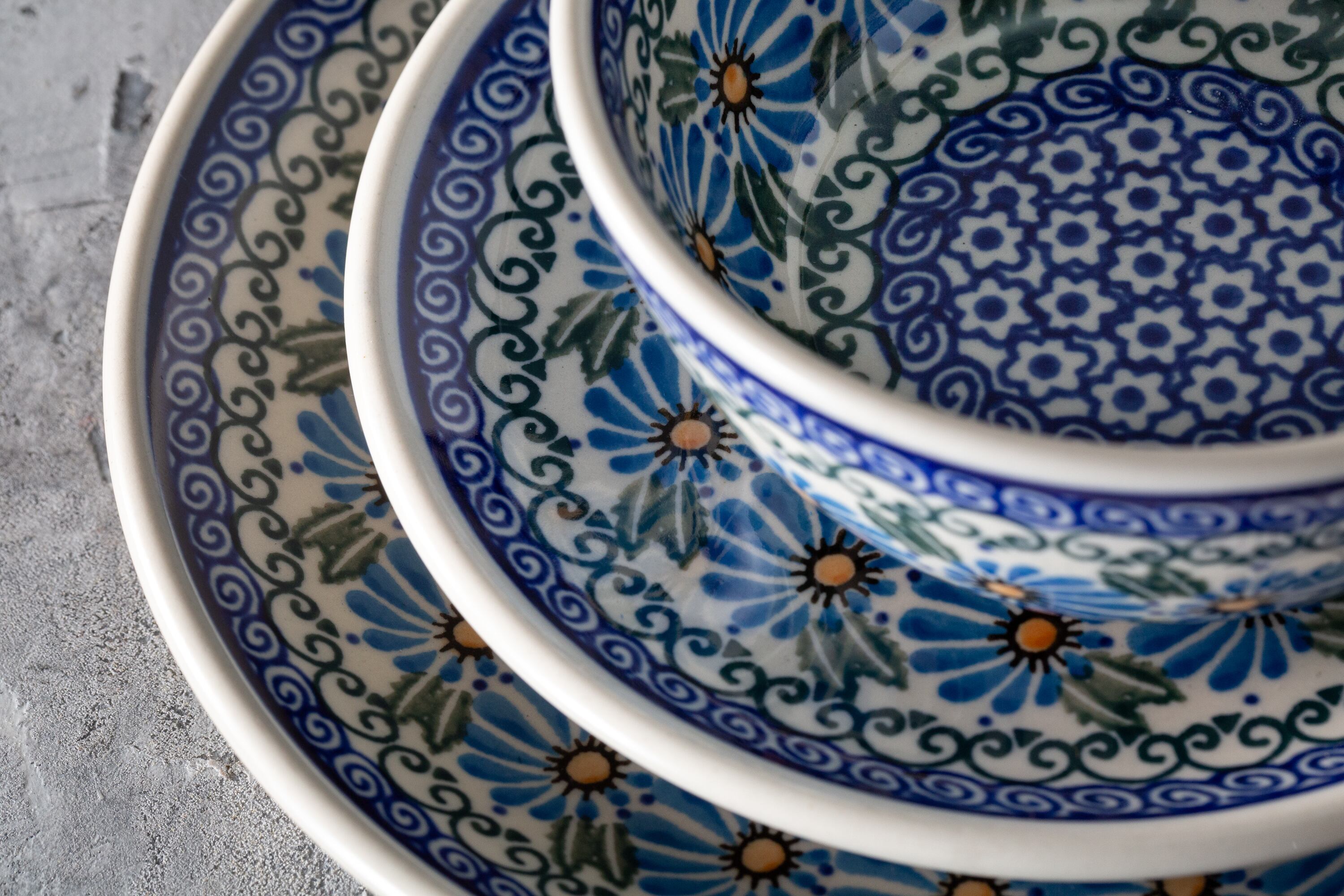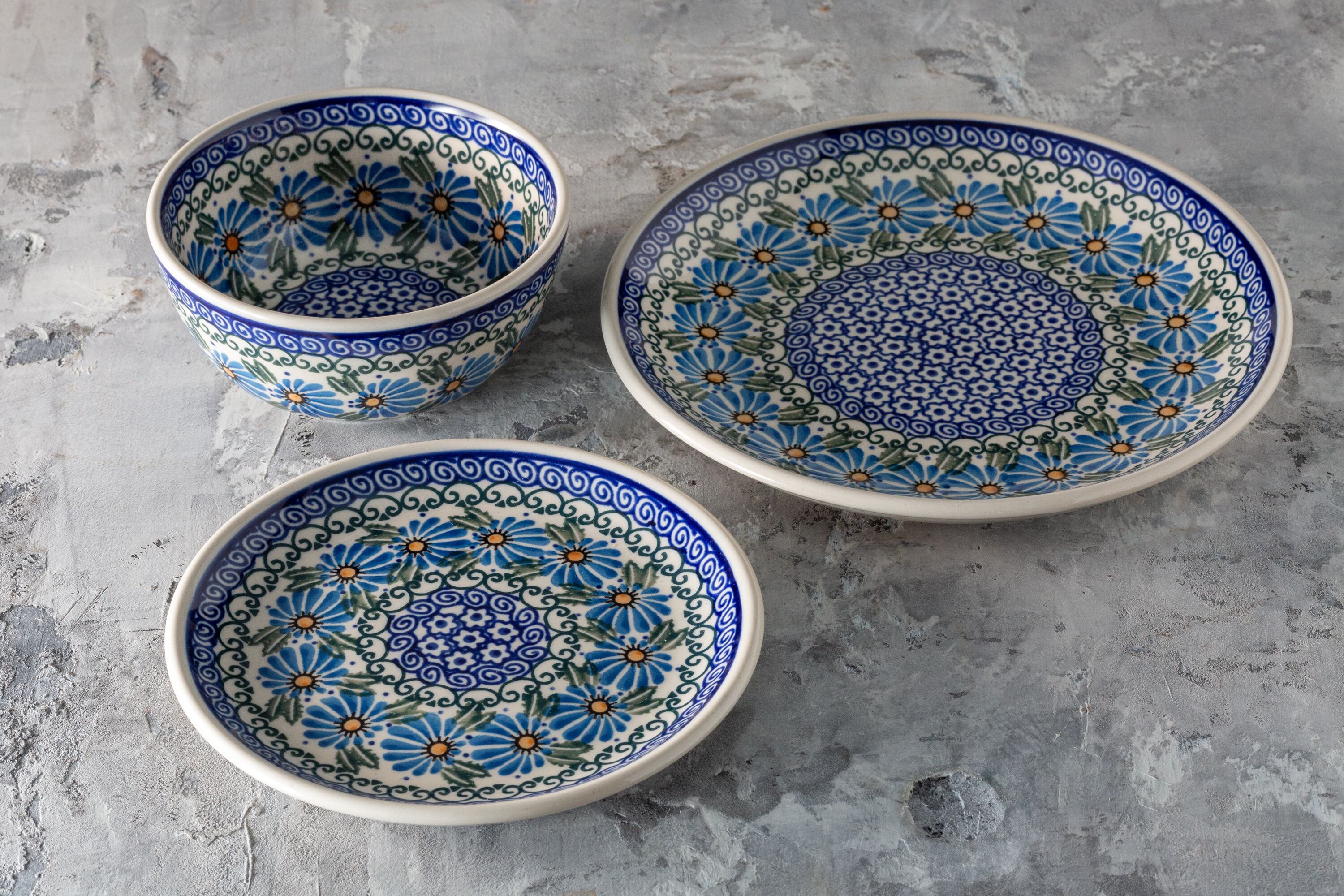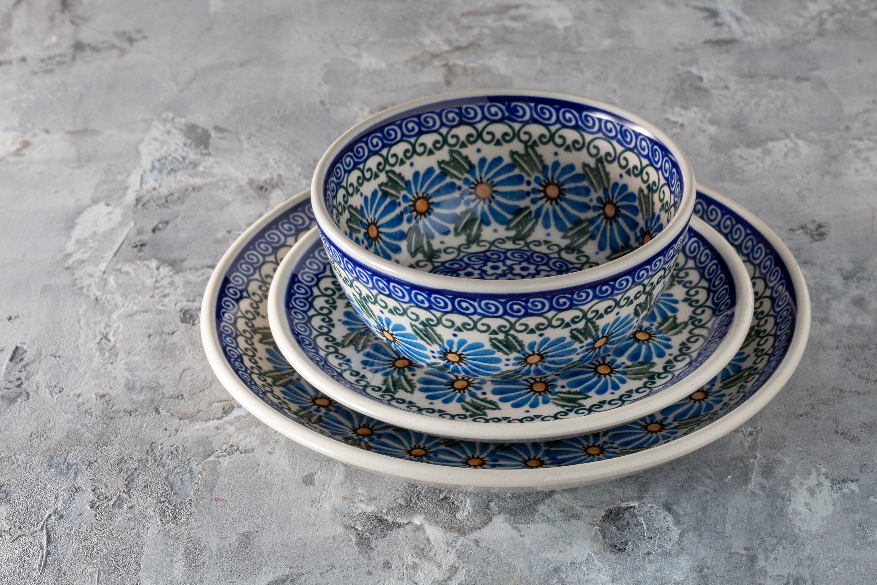 This Ceramika Artystyczna No.835 series set, handcrafted in Bolesławiec, Poland during the 1980s, is a radiant example of traditional Polish pottery. Adorned with hand-painted blue daisy motifs framed by swirling folk-inspired patterns, the set includes a salad bowl and two matching plates.