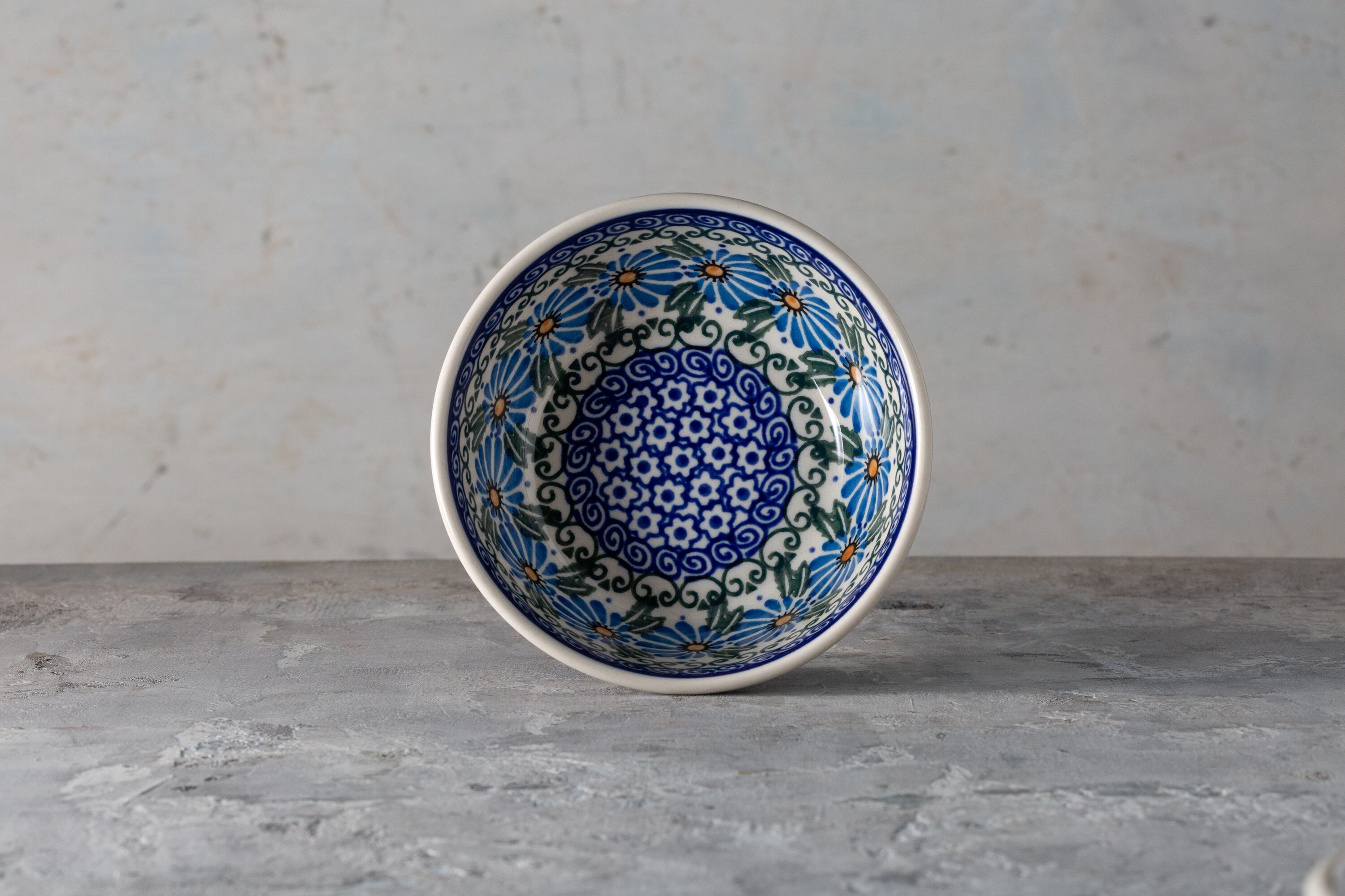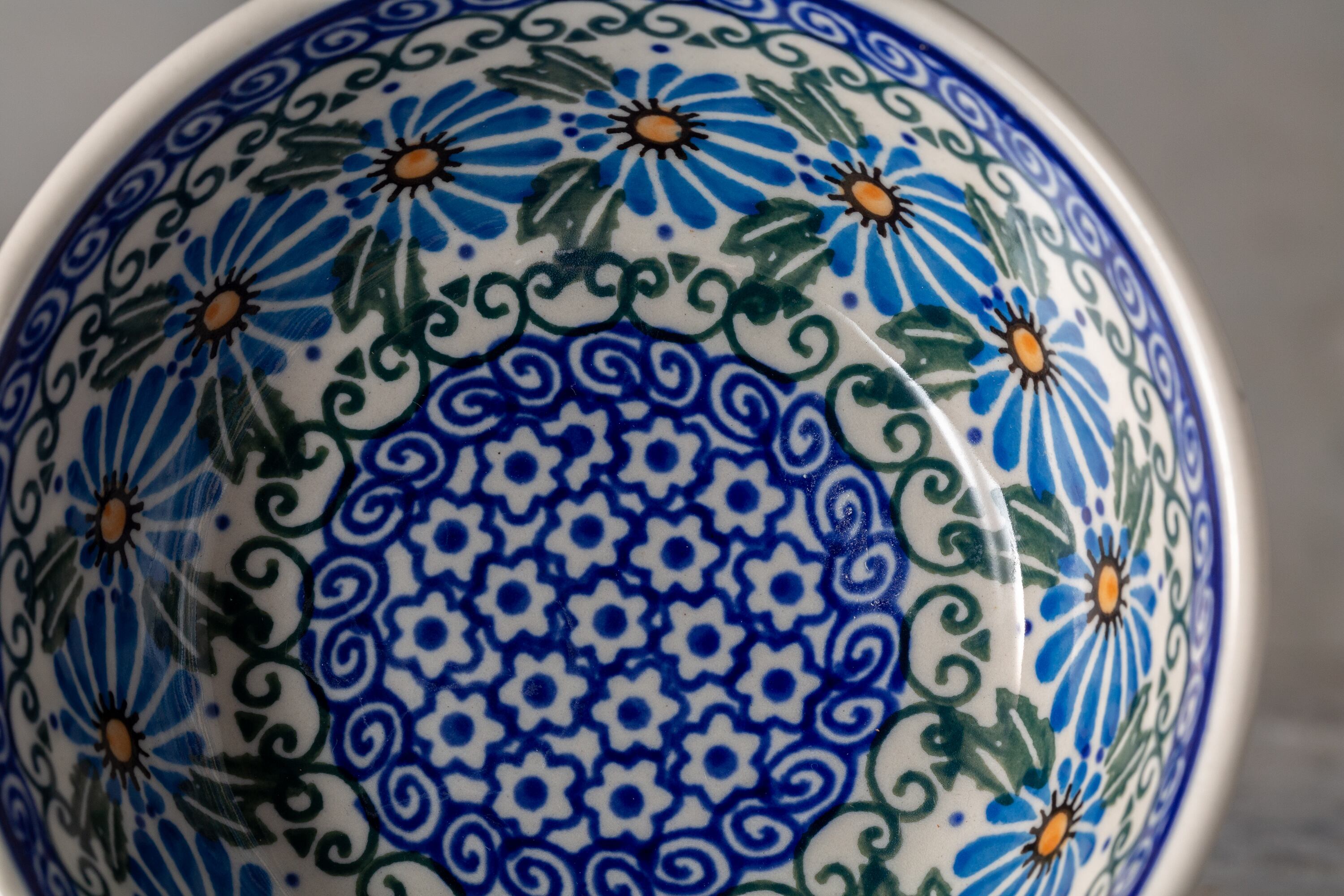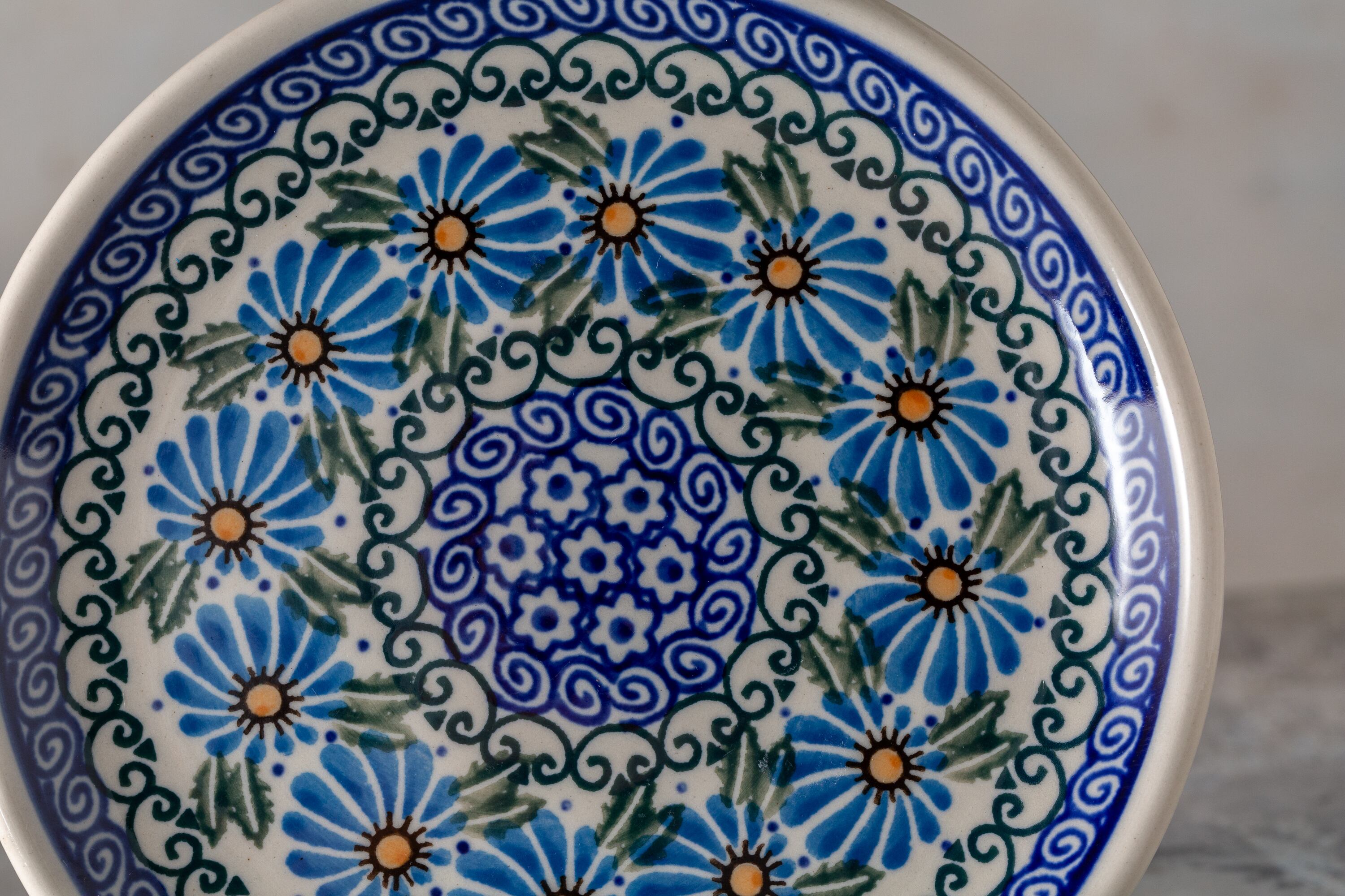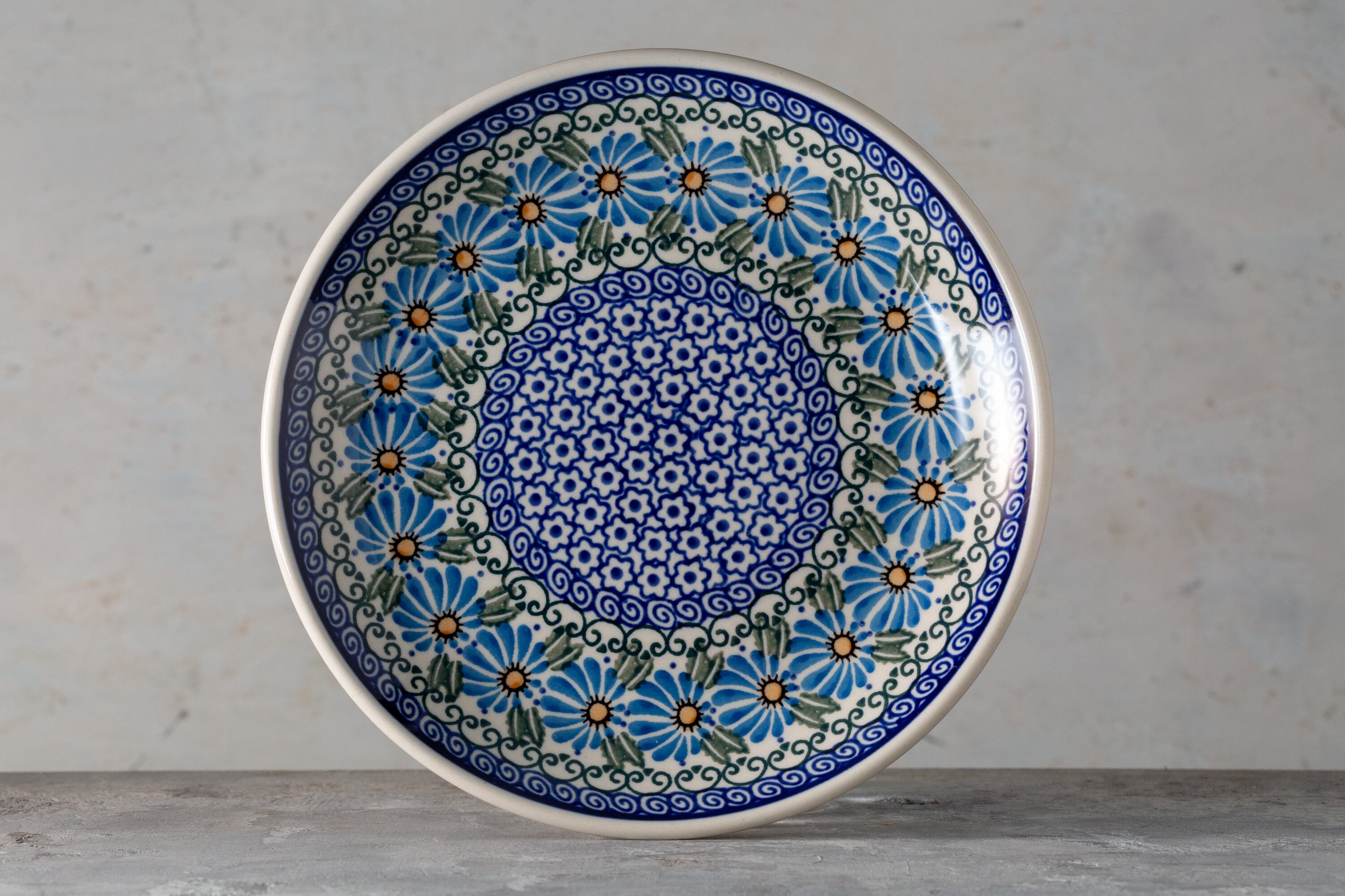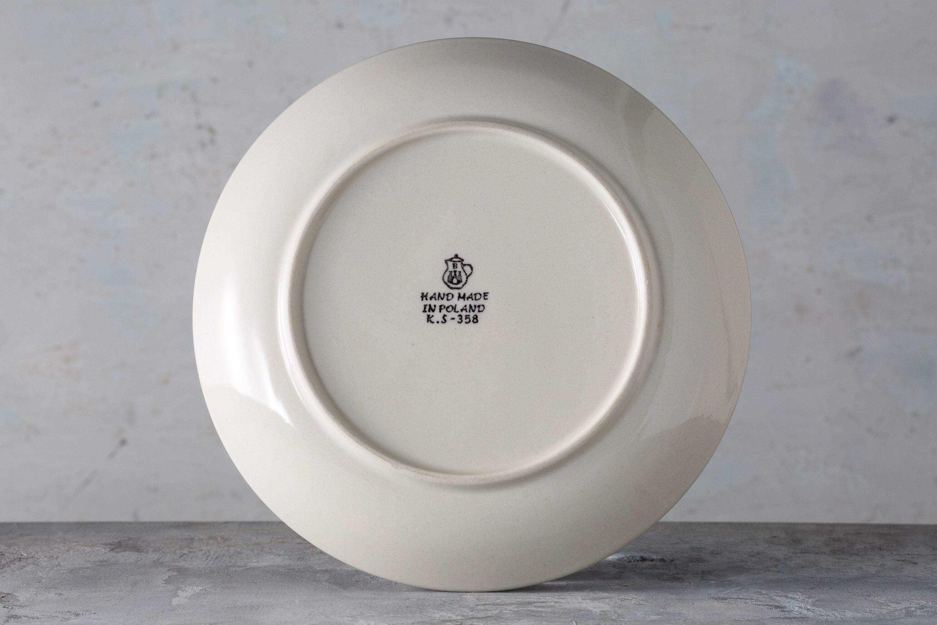 This Ceramika Artystyczna No.835 series set, handcrafted in Bolesławiec, Poland during the 1980s, is a radiant example of traditional Polish pottery. Adorned with hand-painted blue daisy motifs framed by swirling folk-inspired patterns, the set includes a salad bowl and two matching plates.