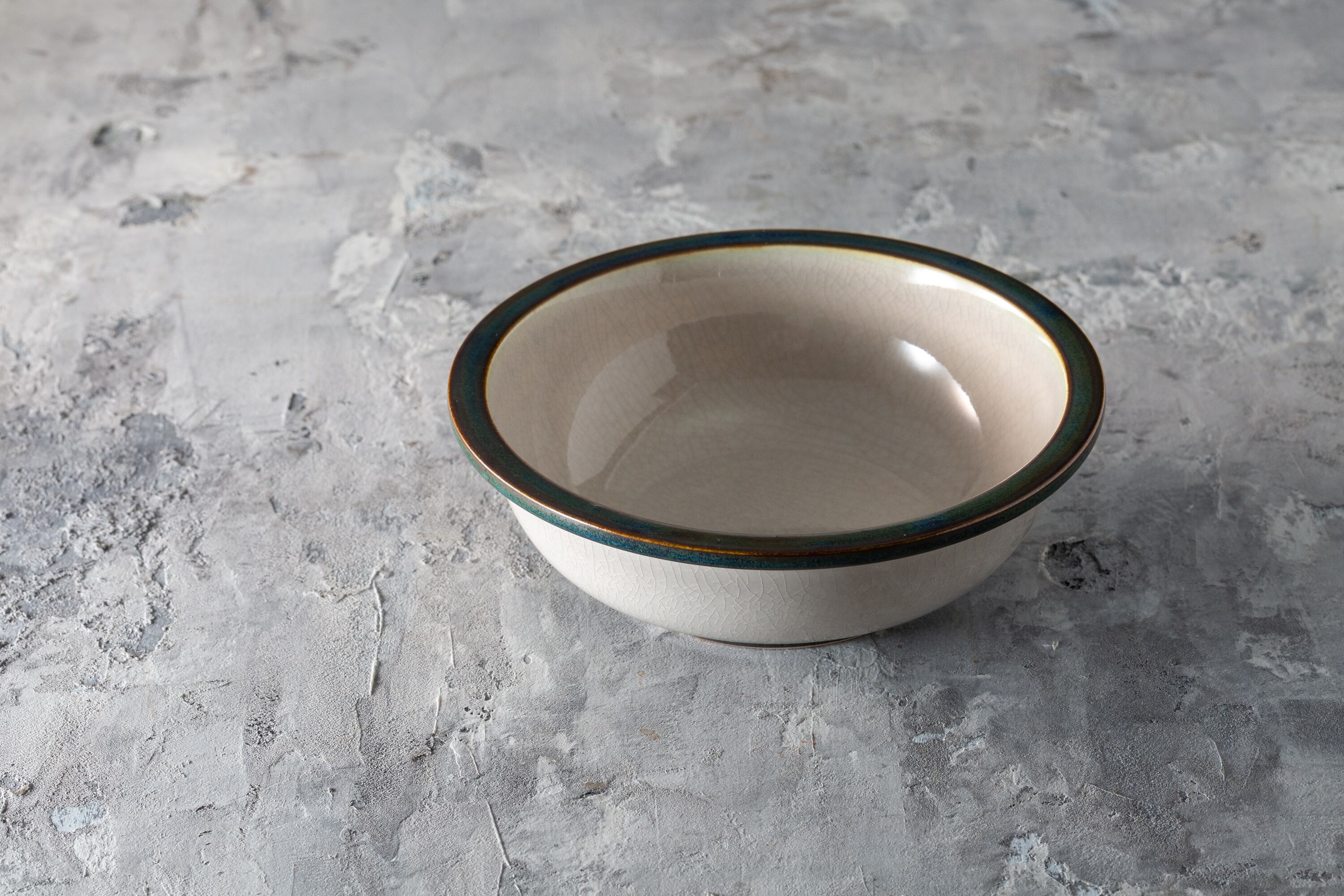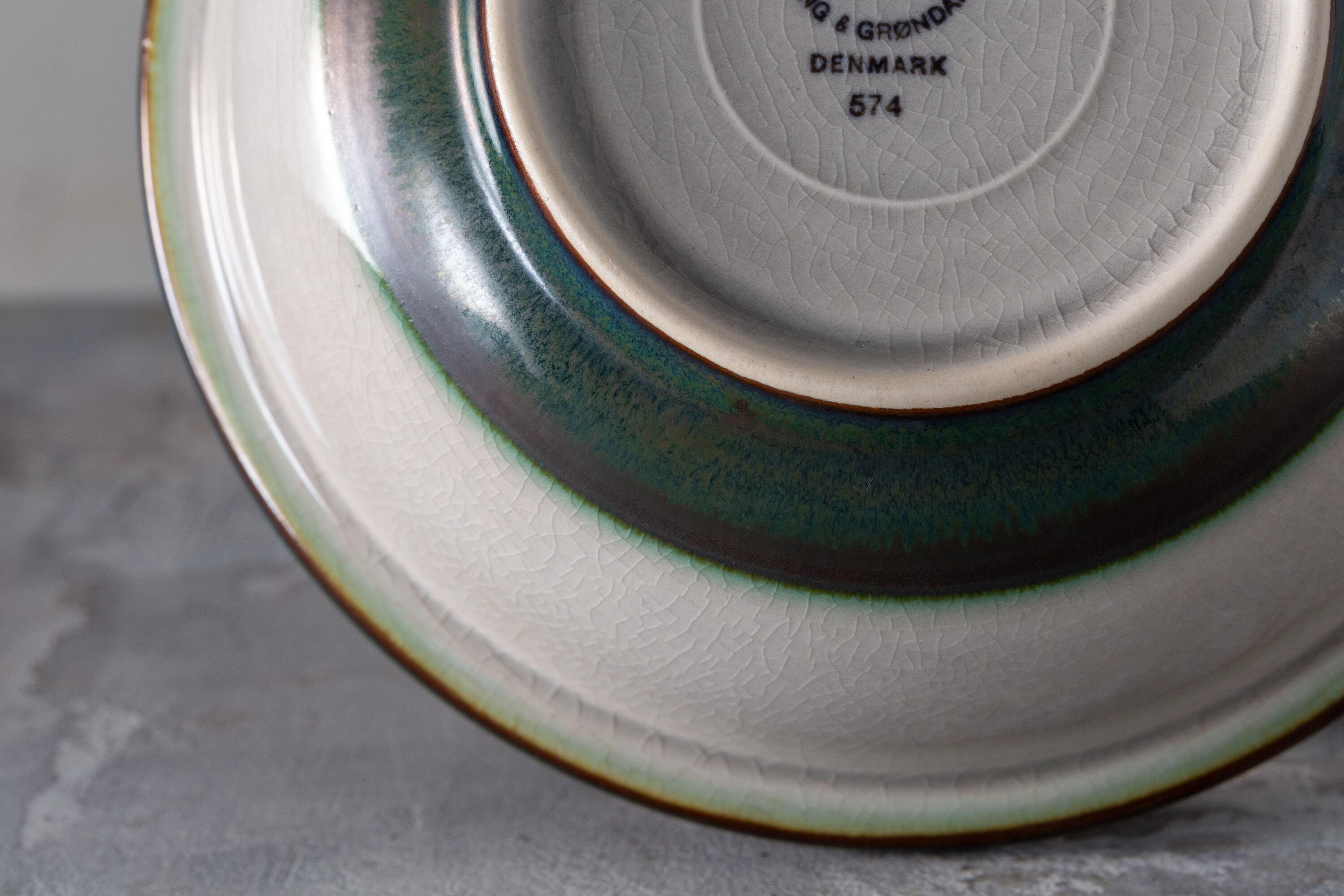 1980年代にデンマークのBing & Grøndahl社で制作された、イェンス・H・クイストゴーの「テーマ」シリーズのボウルです。繊細な色調の釉薬と自然な貫入模様がストーンウェアならではの美を引き立てています。機能性と造形美を兼ね備え、食卓用の器としてはもちろん、サービングボウルやインテリアのアクセントとしても映える一品です。目立った傷はなく良好な状態で、北欧モダンを代表するクイストゴー作品としてコレクターにもおすすめできる逸品です