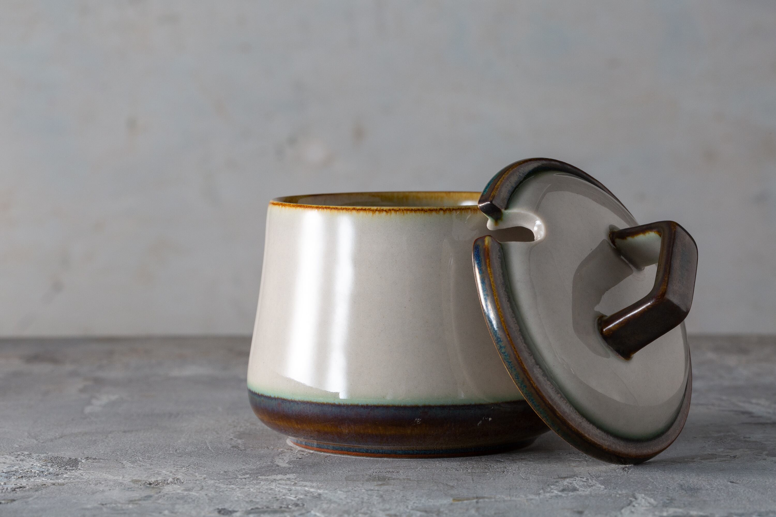 こちらのイェンス・H・クイストゴーによる「テーマ」シリーズのシュガーポットは、1980年代にデンマークのビング・オー・グレンダールで制作されたものです。柔らかな曲線と落ち着いた釉薬が織りなす姿は、温もりと静謐を同時に感じさせ、実用性と美を兼ね備えています。